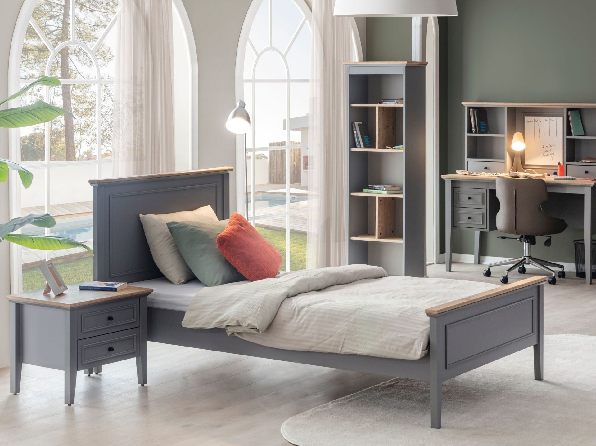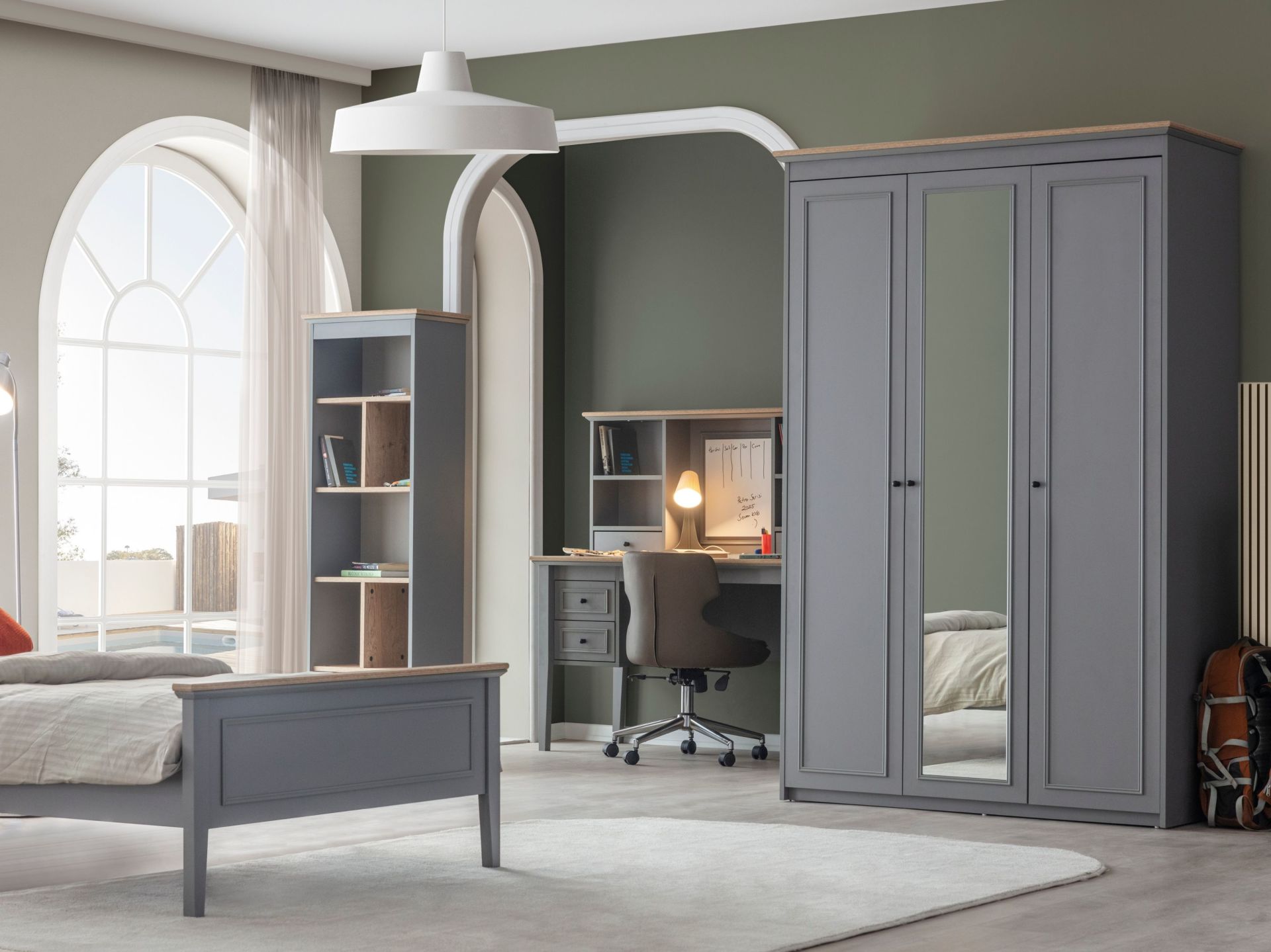 Takım standart içeriği 1 adet 3 kapaklı dolap , 1 adet komodin ve 100x200 başlıklı karyoladan müteşekkildir.