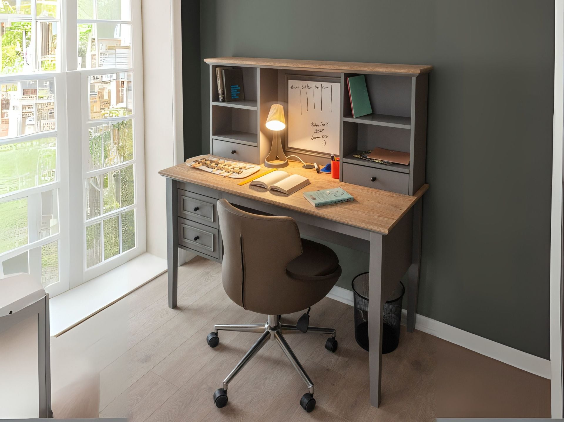 Üst tablo ahşap görünüme sahip olup çizilmeye karsı korumalı olarak üretilmiştir. Üst bloğunda 4 adet raflı bölme ve 2 adet küçük çekmecesiyle beraber kullanım kolaylığında üst sınıfta bir üründür. E1 belgeli kanserojen madde içermeyen 1. Sınıf yonga levhadan üretilmiştir. Kulplar metal malzemedir. Çalışma masasında USB girişli şarj aleti mevcuttur. Çalışma masasında beyaz yazı tahtası kullanılmıştır. Paket içeriğinde kalem ve silgisi de mevcuttur. |