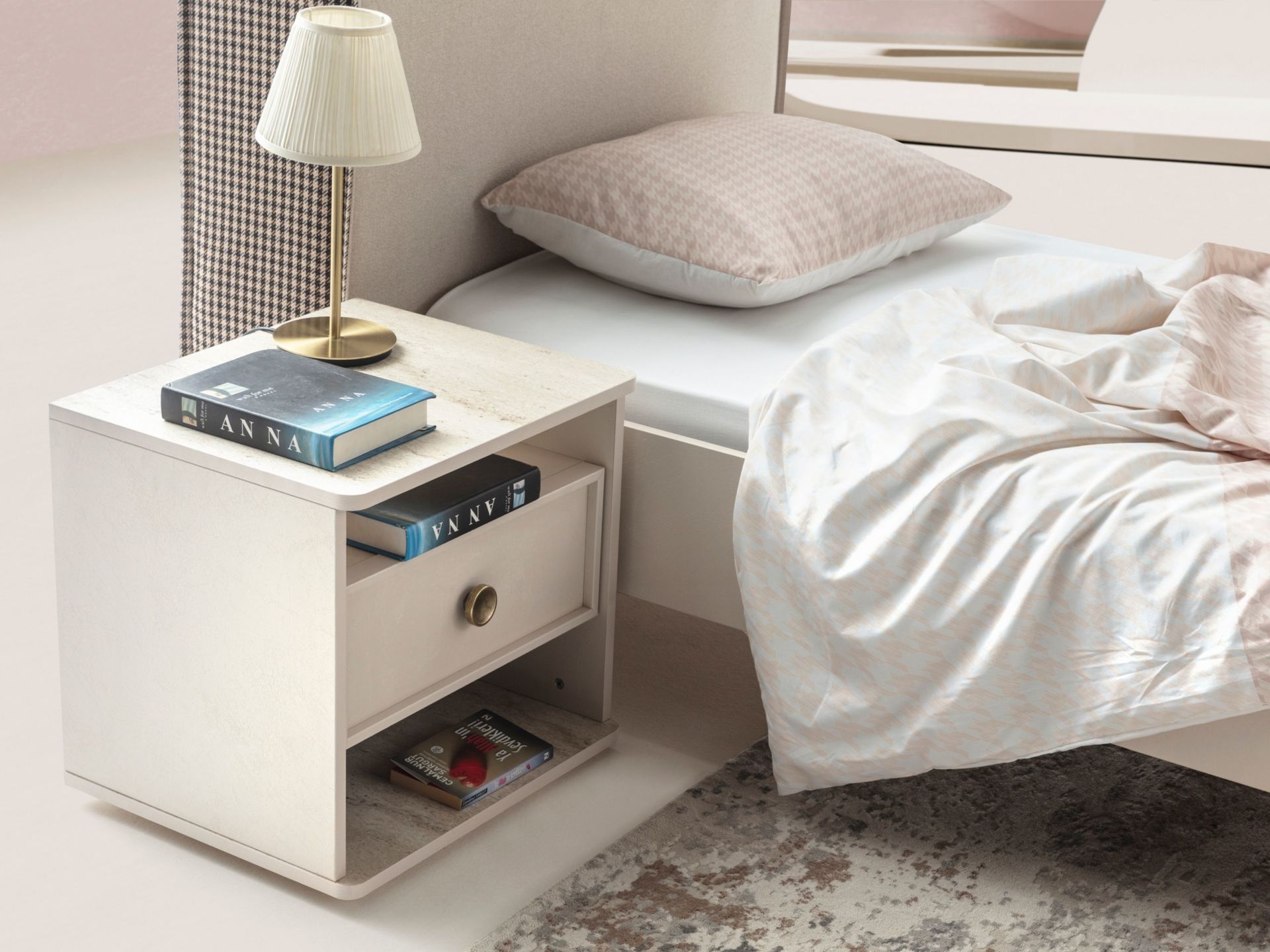 Karyola E1 belgeli kanserojen içermeyen 1. sınıf yonga levhadan üretilmektedir. Karyola başlığı Yonga levha üzeri sünger + kumaş ile bezenmiştir. Kumaş olarak 1. sınıf kolay temizlenebilir kir tutmayan kumaş kullanılmıştır. Ayaklar metal malzemeden mamuldür. Karyola başlığında USB şarj edici aparat mevcuttur. 100x200 karyola, 120x200 karyola, 100x200 bazalı karyola ve 120x200 bazalı karyola seçenekleri vardır.