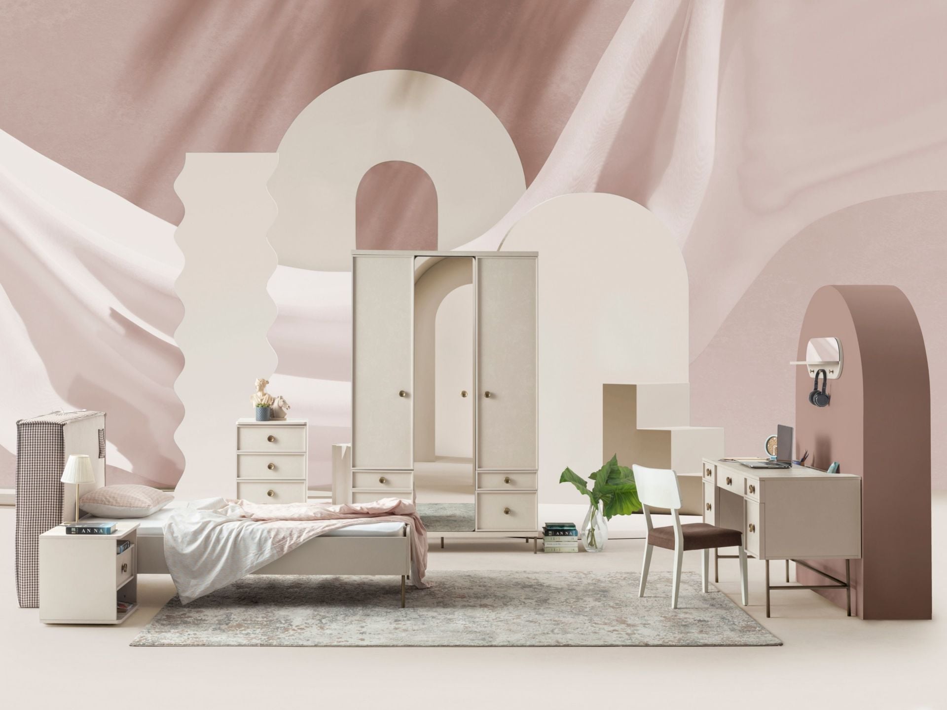 Takım içeriği 1 adet 3 kapaklı dolap, 1 adet komodin ve 1 adet 100cmx200cm başlıklı karyoladan oluşmaktadır. |