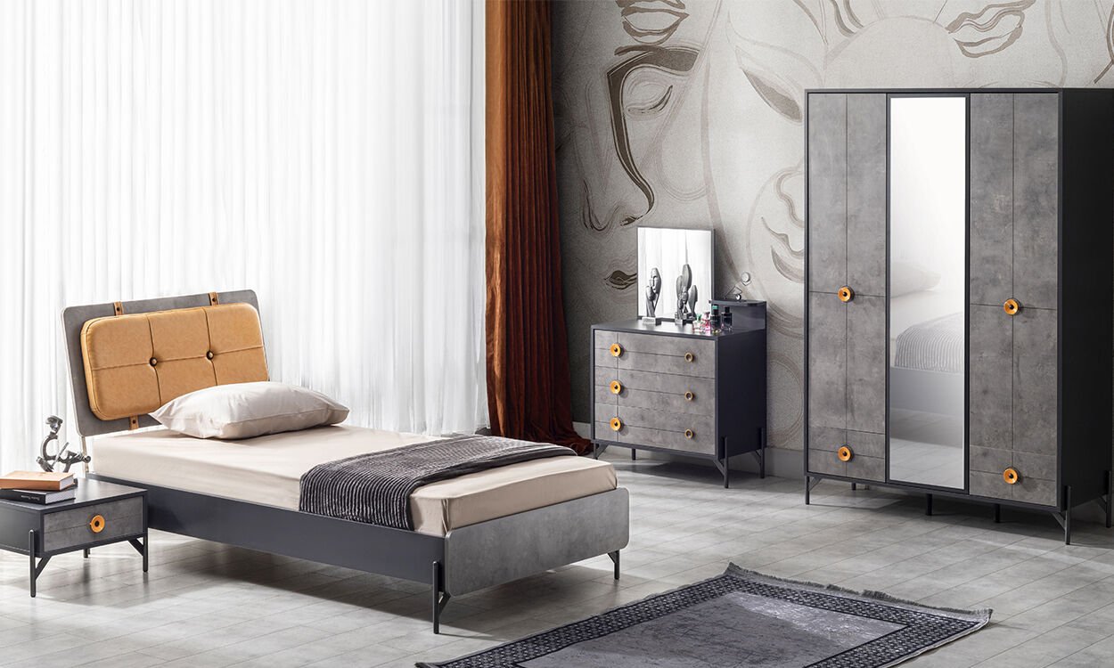 Ürün içeriği; 100*200 cm Başlıklı Karyola, 3 Kapılı Dolap ve komodinden oluşmaktadır.