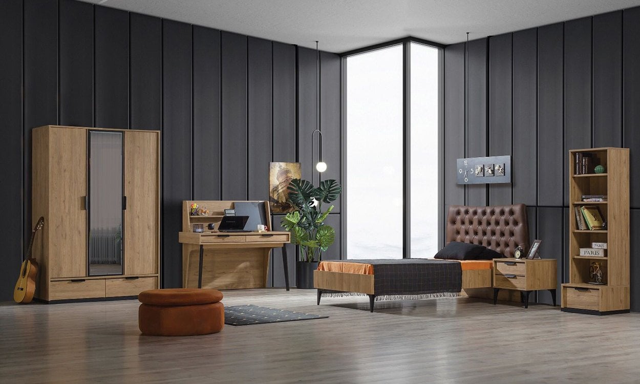 Ürün içeriği; 100*200 cm Başlıklı Karyola, 3 Kapılı Dolap(Aynalı) ve komodinden oluşmaktadır.