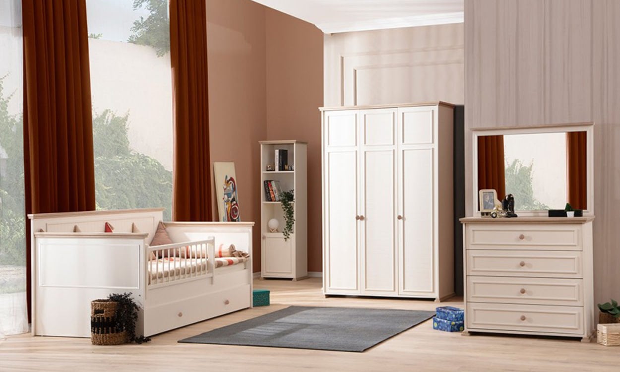 Ürün içeriği; Sedir Yavrulu karyola, 3 kapılı dolap ve şifonyerden oluşmaktadır.