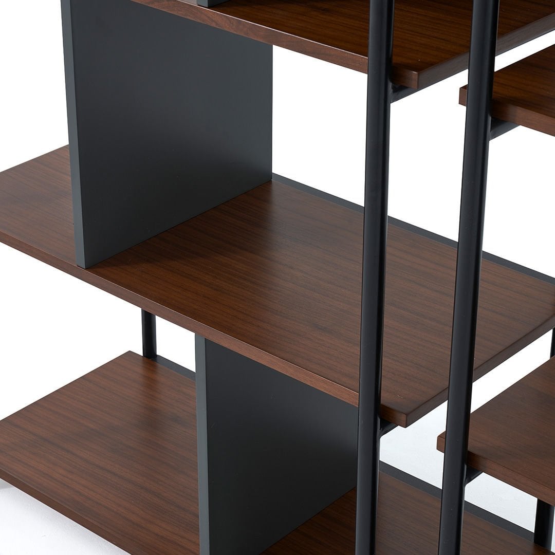 Pecan Konsol, cevizin sıcaklığı ve antrasitin modern etkisi ile dengeli bir şıklık sunar. Ceviz kaplamaya uygulanan yatay ve dikey hareketler ile yakalanan asimetrik uyum ile hem zamanı yakalar hem de zamansızlık vaat eder. Koleksiyonun yüksek metal ayakları ve keskin hatları seçkin detaylarıyla sadelik ve şıklığı bir arada bulundurur.Ürün Tanımı: Pecan Kitaplık.    Malzeme: Ayaklarda mat siyah elektrostatik boyalı metal malzeme kullanılmış olup raflar doğal freze amerikan çeviz kaplama malzemesi kullanılmıştır.   Bakım: Ilık sabunlu su yardımıyla temizlenebilmektedir.   Genişlik: 84 cm    Derinlik: 43 cm    Yükseklik: 172 cm