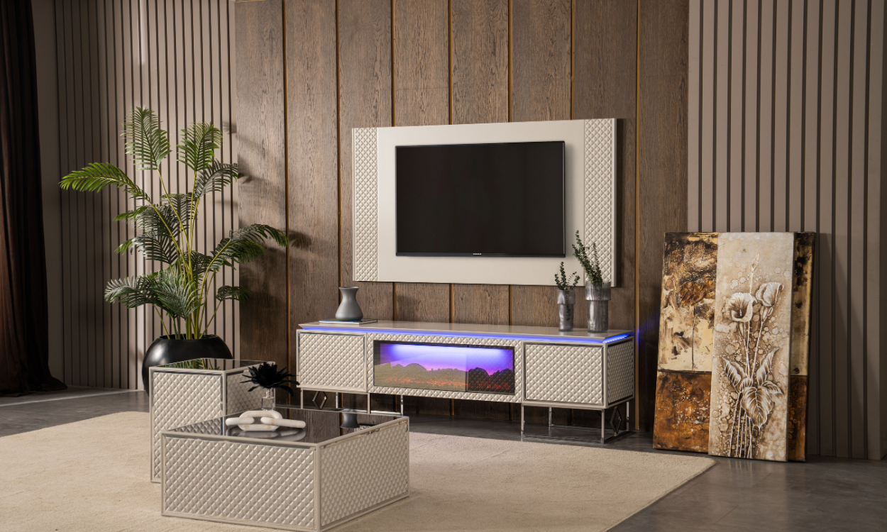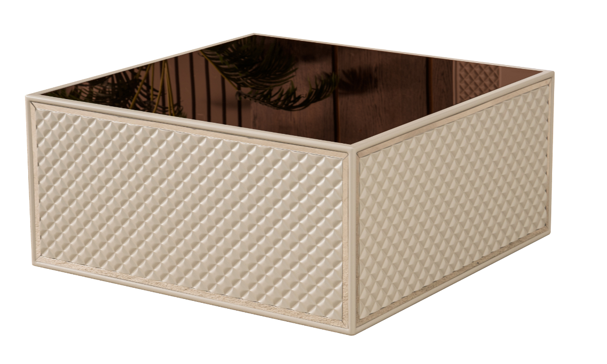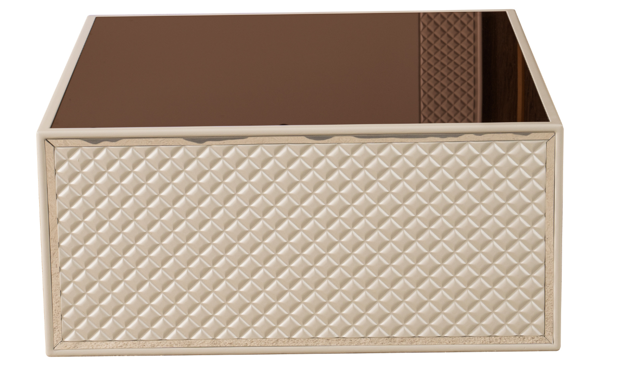 Ana gövdesi ve ön yüzeyler MDF malzeme üzeri lake boya kaplama olarak CNC ile dekorlanarak üretilmiştir. Üst yüzey reflekte, karatılmış cam ile kaplanmıştır.