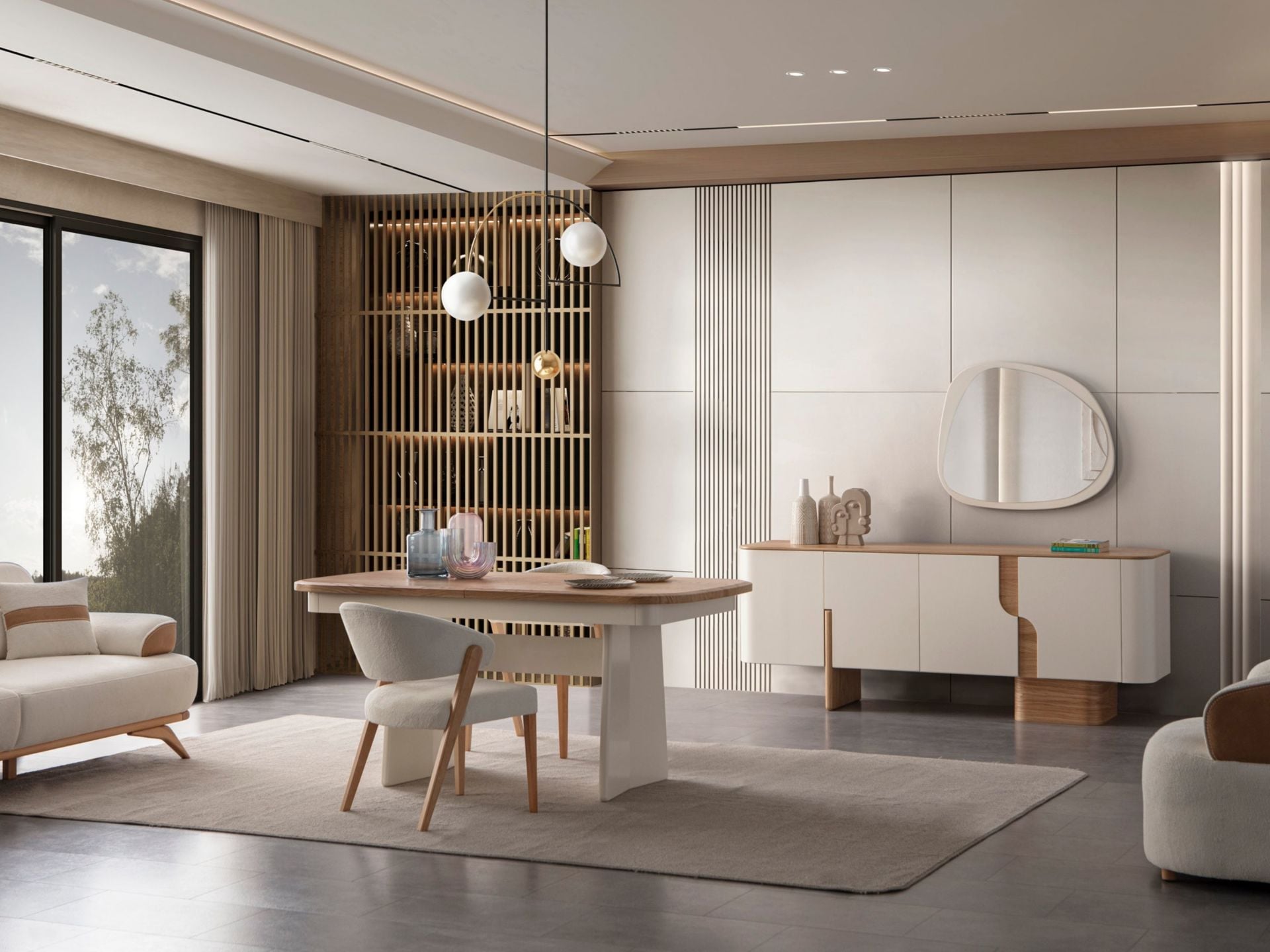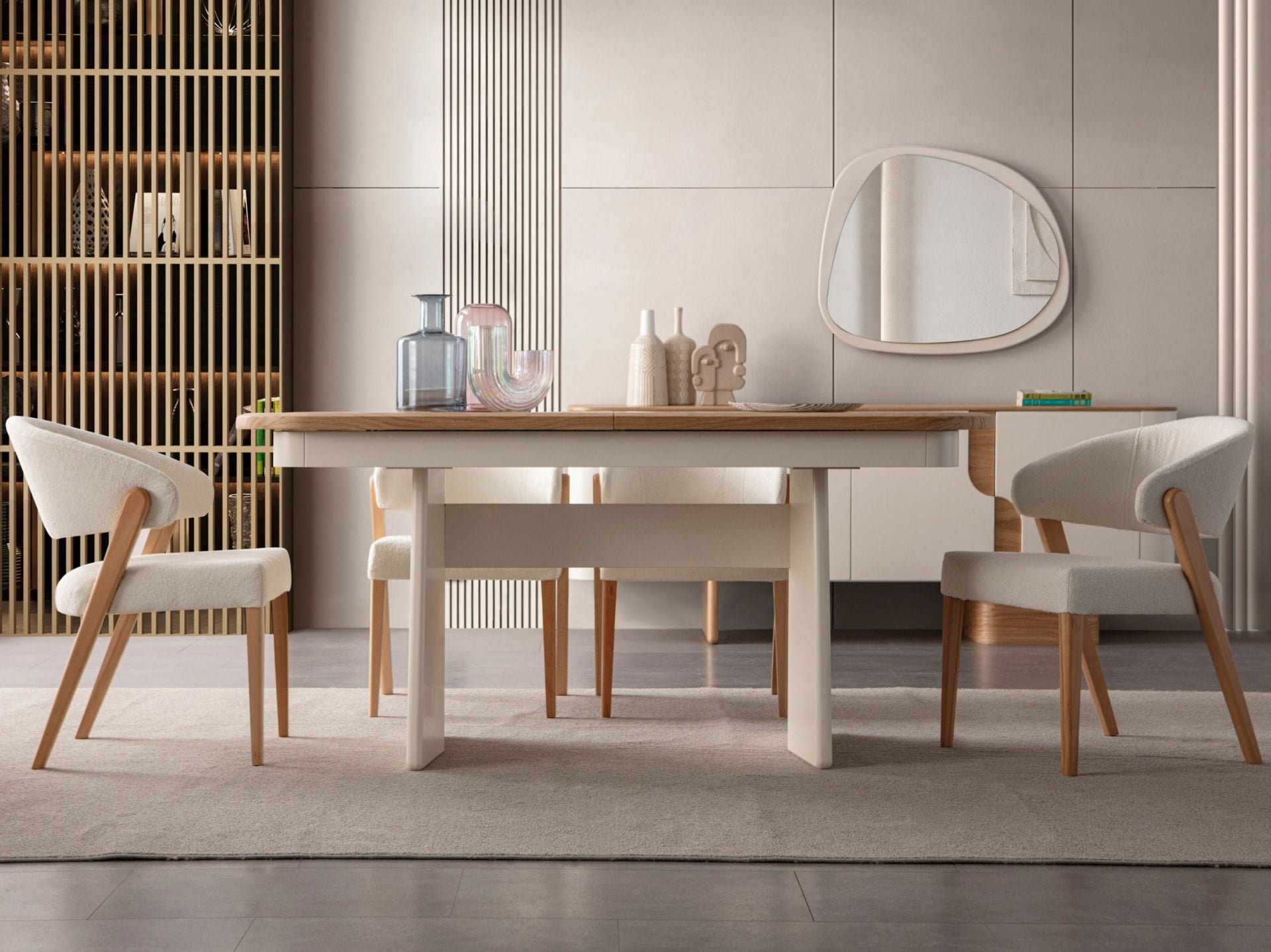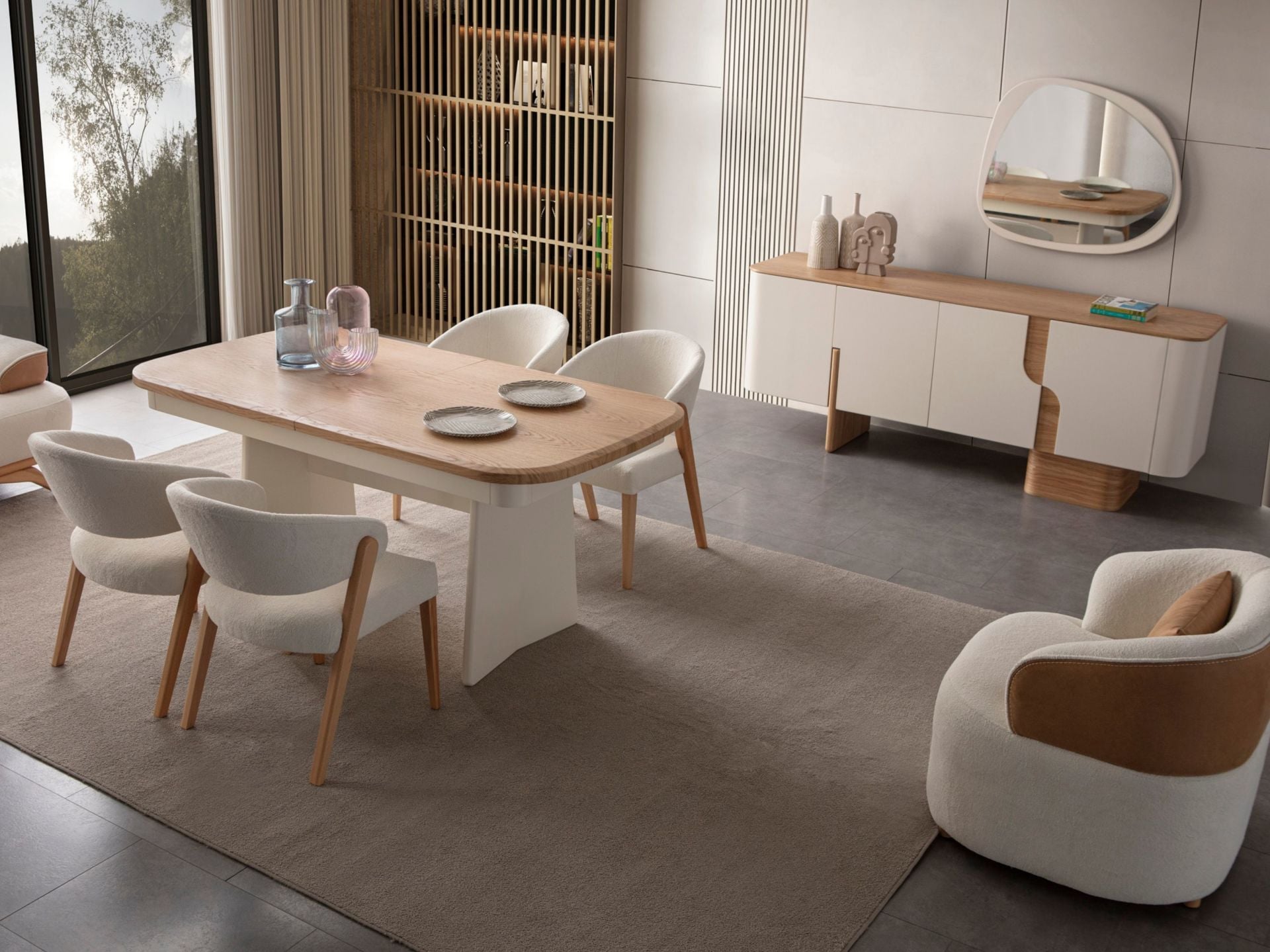 Takım içeriği 1 adet yemek masası, 6 adet sandalye, 1 adet konsol ve konsol aynasından müteşekkildir. Takım elemanlarını modüler olarak ayrı ayrı satın alabilirsiniz.