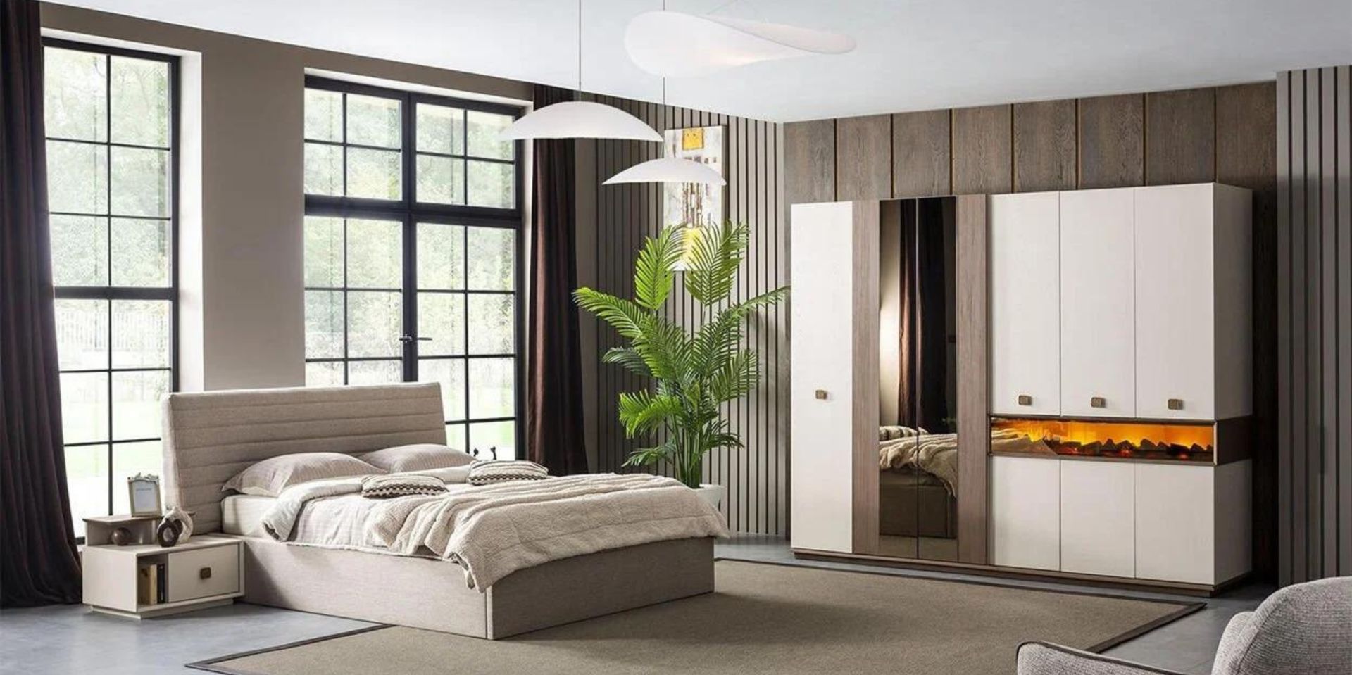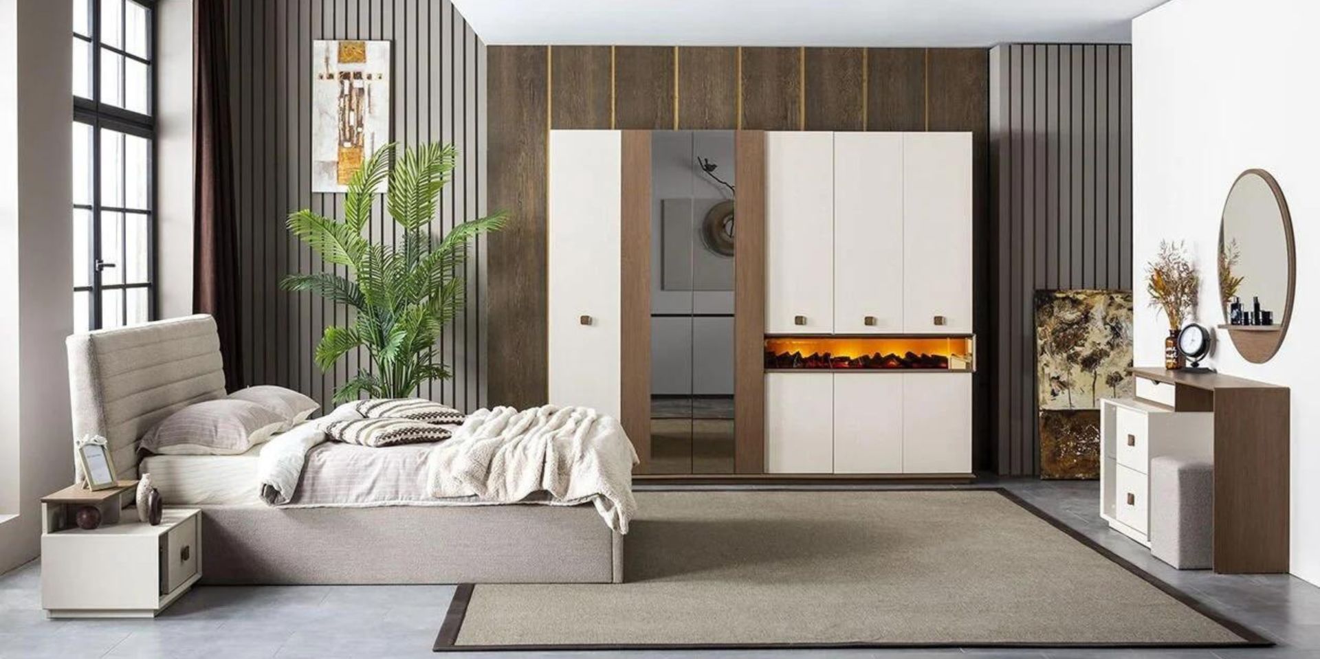 · Takım İçeriği; 6 Kapaklı Şömineli Dolap, Başlıklı Bazalı Karyola, Şifonyer+Ayna+puf ve 2 adet komodinden oluşmaktadır.