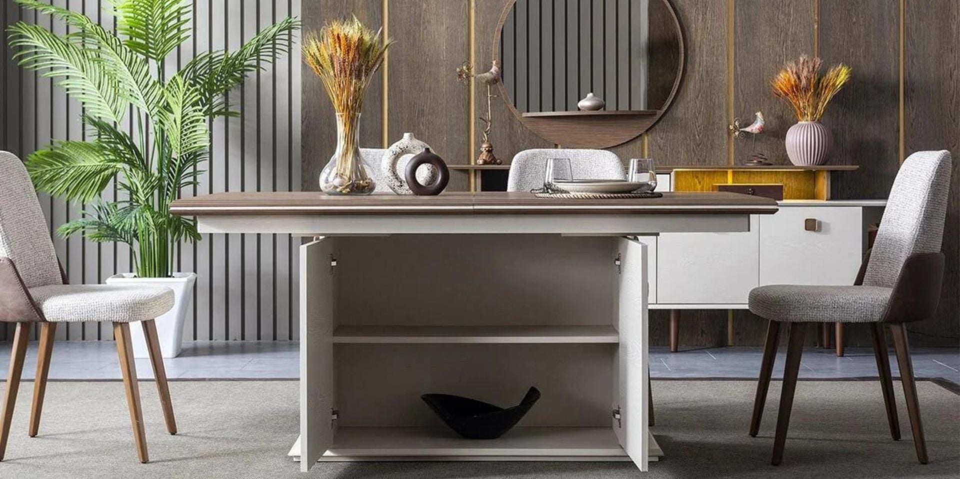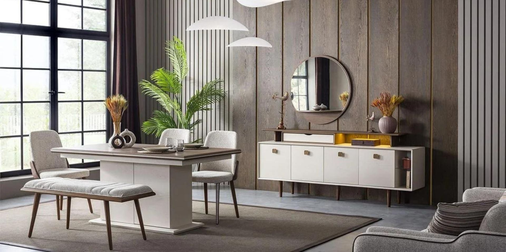 · 1 adet açılır masa, 4 adet sandalye,1 adet bench ve 1 adet konsoldon oluşmaktadır.