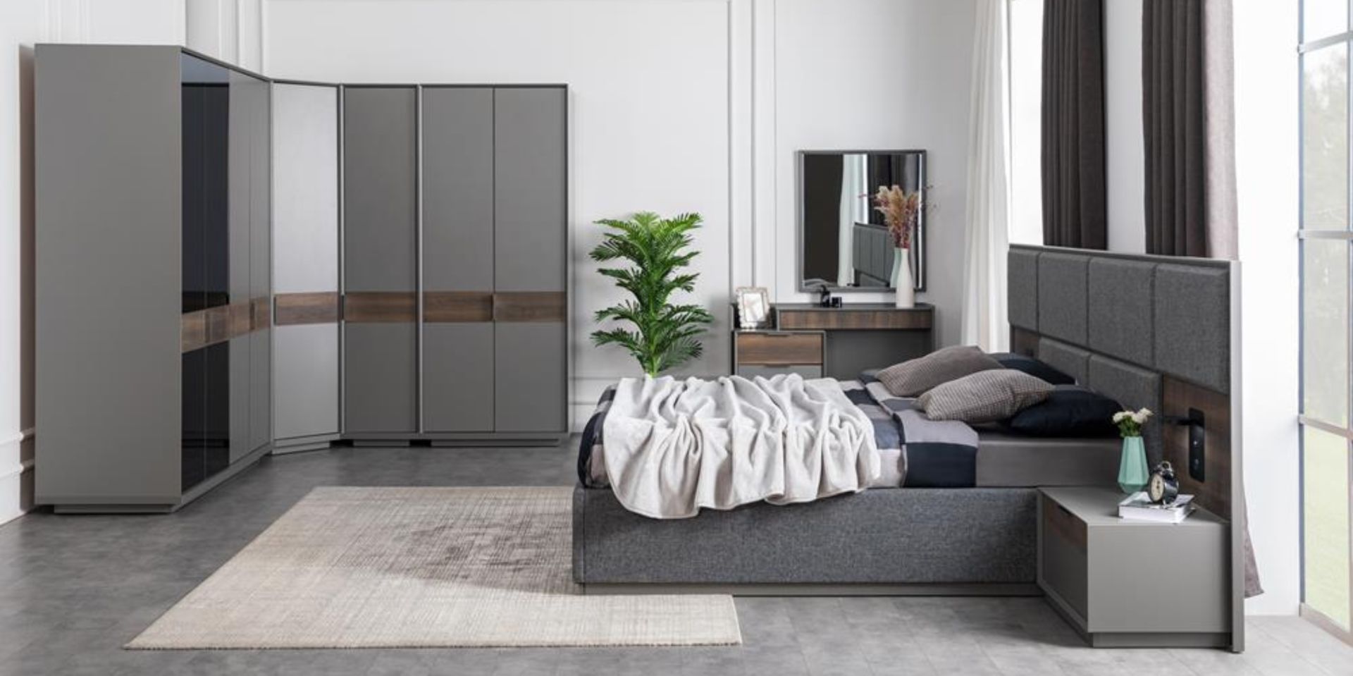 · Yatak odası takım içeriği; 4 kapılı dolap,1 adet köşe modül,1 adet iki kapılı dolap,1 adet tek kapılı dolap, başlıklı bazalı karyola, şifonyer ve 2 adet komodinden oluşmaktadır.