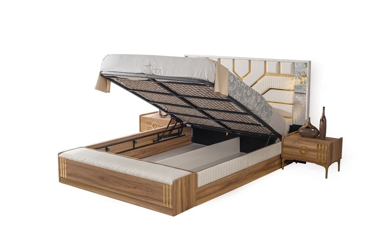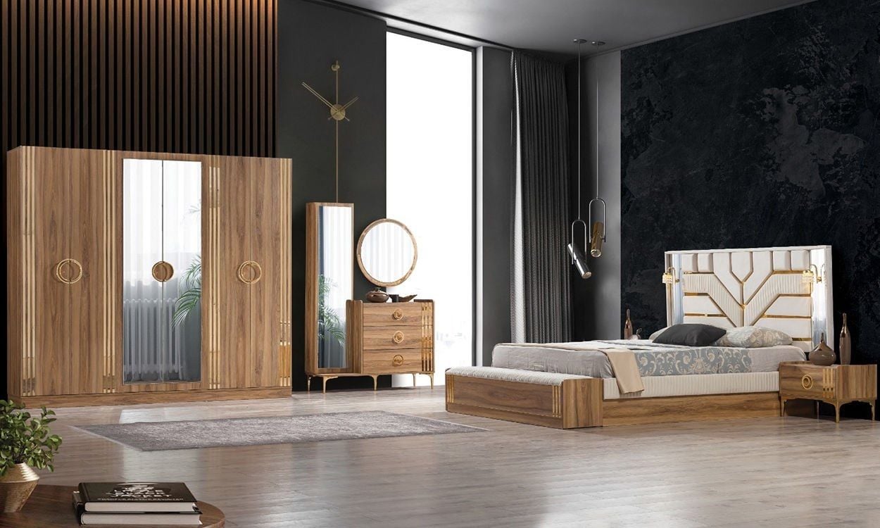 · Yatak odası takımı 1 adet 6 kapaklı dolap, başlıklı karyola, aynalı şifonyer, bench, puf ve 2 adet ışıklı ayna levhalı komodinden oluşmaktadır.