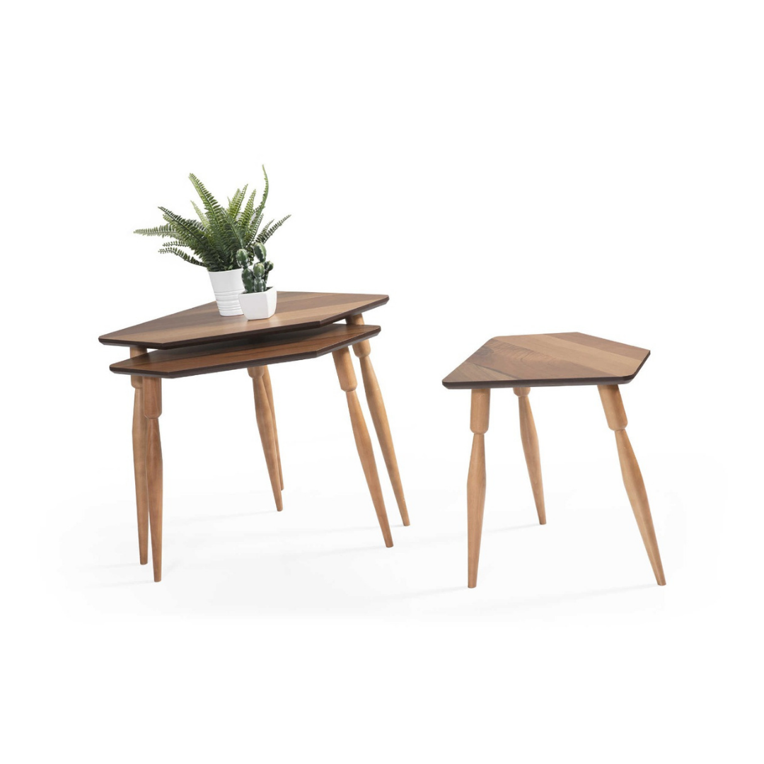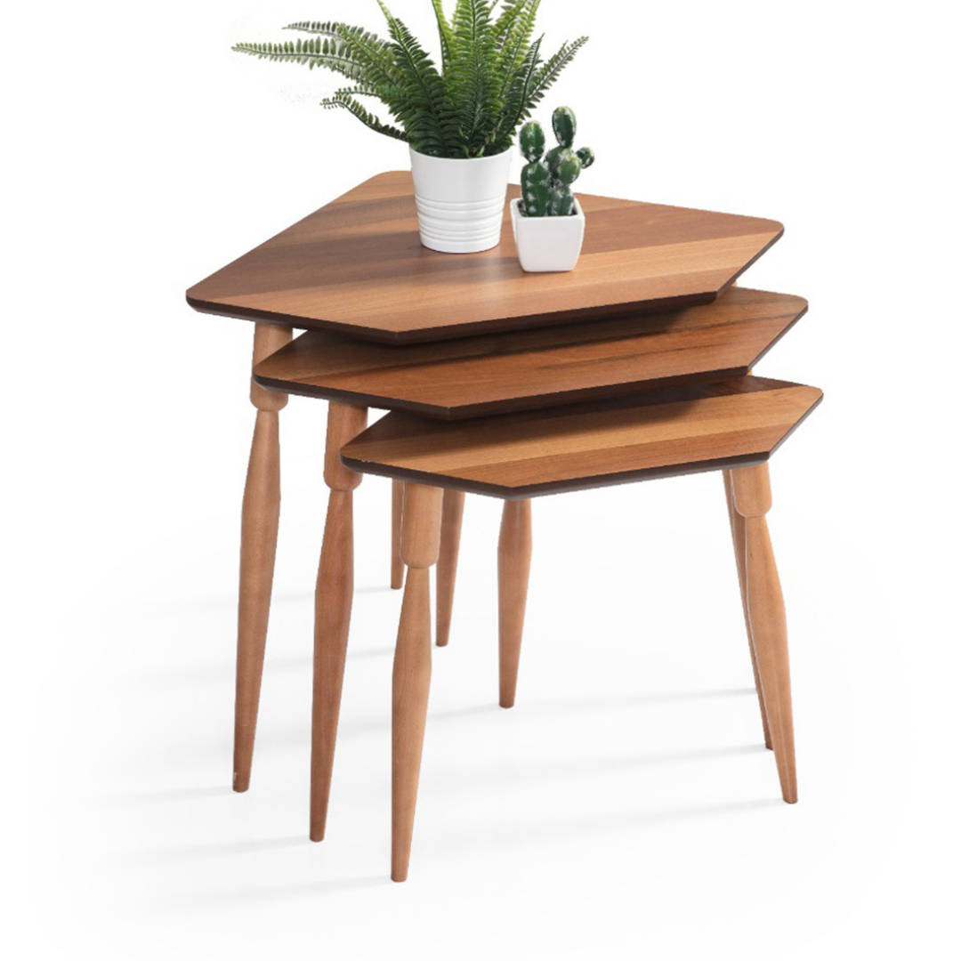 Zen Zigon Sehpa Ürün Açıklaması Zen Zigon Sehpa, minimalist ve modern tasarımı ile dikkat çeker. Ahşap yüzeyi ve metal ayakları, estetik ve dayanıklılığı bir araya getirir. Üçlü set halinde sunulan bu sehpalar, yerden tasarruf sağlar ve ihtiyaç duyulduğunda kolayca kullanılabilir. Zen Zigon Sehpa, oturma odaları, salonlar ve ofisler için mükemmel bir tamamlayıcı mobilyadır. Estetik ve fonksiyonelliği bir arada sunan bu sehpa seti, yaşam alanlarınıza zarif bir dokunuş katar. VİDALI MONTAJ EL ALETLERİ İLE KOLAY KURULUM Ağırlık: 13 kg Hacim: 0,11 m3 Renk: CEVİZ Ayak Rengi: CEVİZ Ayak Malzemesi: GÜRGEN Üst Tabla Malzemesi: MDF SEHPA İÇİN DETAYLAR H: W: D BÜYÜK: 56X67X40 CM ORTA:  51X62X40 CM KÜÇÜK: 46X57X40 CM