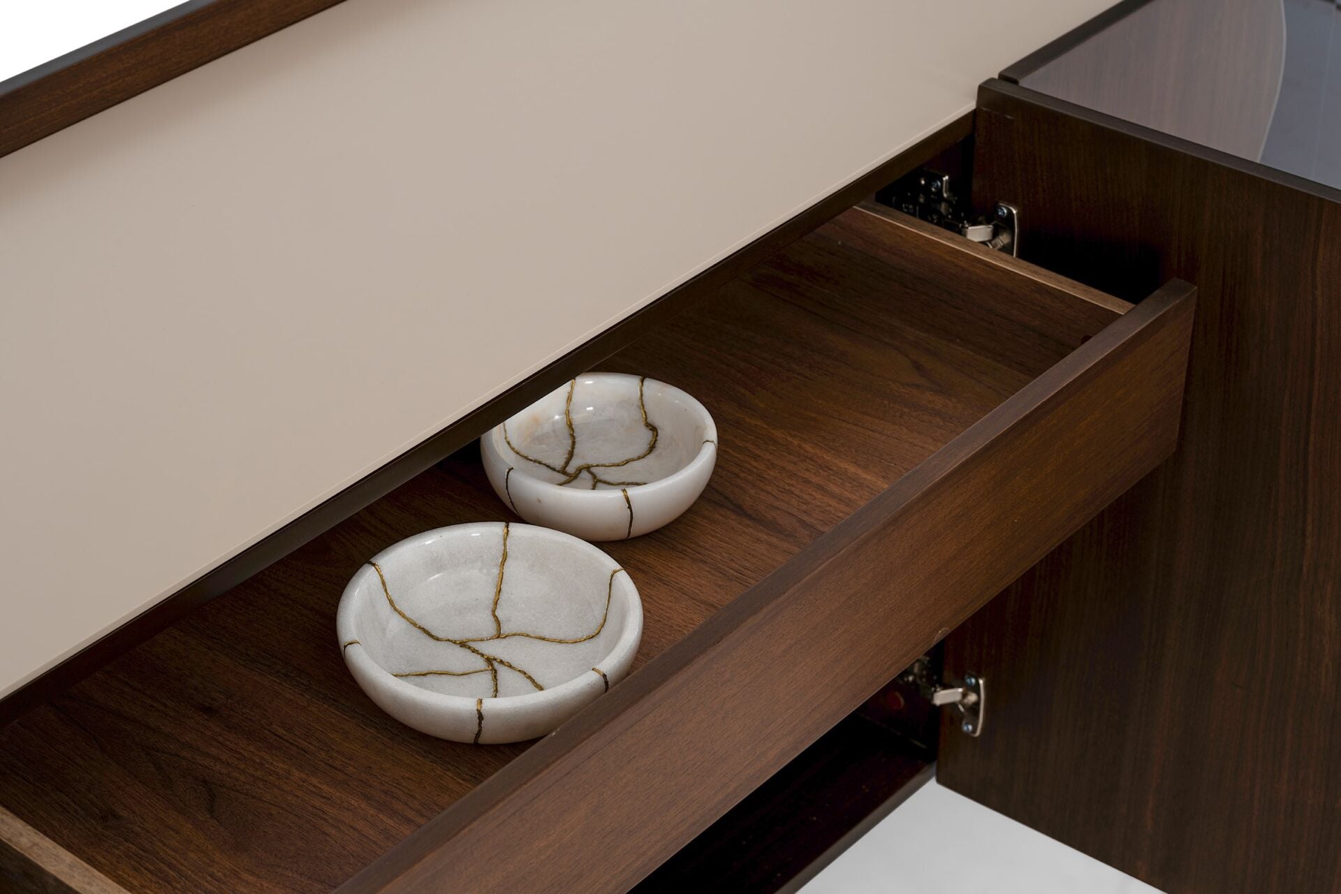 Ceviz kaplamanın zamansızlığını pastel lake tonu füme cam,amber ışık ve metalik detaylar ile buluşturan Tawny Koleksiyonu nitelikli tasarımı ve lüks tarzıyla öne çıkıyor.Freze kaplamadaki yön hareketleri ve çizgisel kıvrımları ile modern lüks tarzını yaşam alanlarına yansıtıyor. Koleksiyonda bulunan opsiyonel parçalar kullanıcısına alışılmışın dışında ve ihtiyaca göre seçenekler sunuyor.Ürün Tanımı: Tawny Konsol.Ürün Malzemesi: Doğal freze amerikan ceviz kapladan üretilmişolup üst tablasında kumsal ipek mat lake malzeme kullanılmıştır. Ayaklarda kum beji elektrostatik boyalı metal malzeme kullanılmıştır. Konsol içerisinde aydınlatma mevcuttur.Bakım: Ilık sabunlu su yardımıyla temizlenebilmektedir.Genişlik: 220 cmDerinlik: 52 cmYükseklik: 84 cm