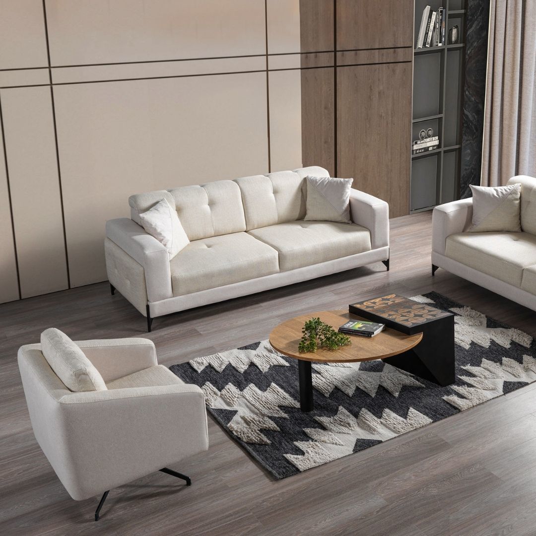 Ukyco Kapadokya Koltuk TakımıÜRÜN AÇIKLAMASIUkyco Kapadokya Koltuk Takımı, modern çizgileri ve zarif tasarımıyla oturma alanlarınıza şıklık katıyor. Yüksek kaliteli kumaşlarla üretilmiş olan bu takım, konforlu oturum yapısı ve estetik detaylarıyla göz alıcı bir görünüm sunar. Geniş oturma alanı,ergonomik yapısı, rahat sırt yaslama özellikleri ile uzun süreli kullanımda bile konforu korur. Kapadokya Koltuk Takımı, sade ama etkili renk ve dokularıyla her türlü iç mekâna uyum sağlar ve odanızı dönüştürür. Dayanıklı malzemeleri sayesinde uzun yıllar boyunca şıklığını kaybetmeden kullanabileceğiniz bu takım, hem estetik hem de fonksiyonellik arayanlar için ideal bir tercihtir.Sünger32 DSKumaşBİRİNCİ SINIF DOKULU KETENPARÇA SAYISI 3+3+1 /    7 OTURUMÖLÇÜ DETAYLARI 3 LÜ DETAY: W: 225 CM  H: 80 CM  D: 90 CMBERJER DETAY: W: 75 CM H: 75 CM D: 75 CM