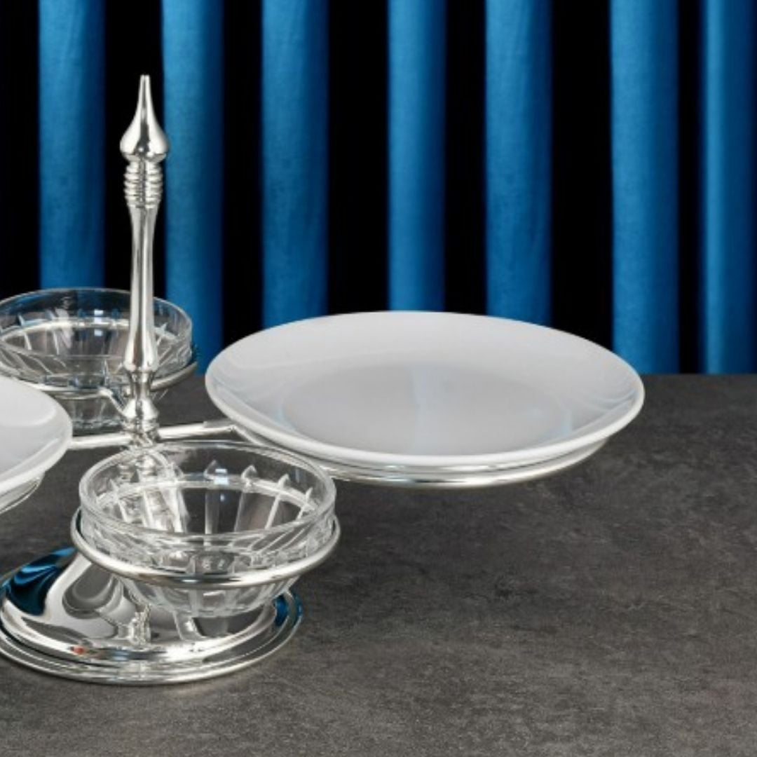 Ukyco Tatlı Servis Stantı 2 li malzeme : pirinçrenk : gümüş mikron kaplama 21 cm porselen tabak 10 cm cam kase