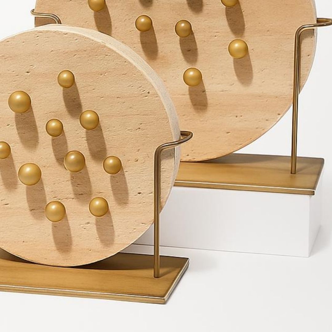 Traverten Top Dekorlu Disk 2 li set Ahşap Kaidelimalzeme : travertne mermer kaide : ahsap altlık metal stant ölçü : küçük : 24 cm cap / büyük 30 cm cap