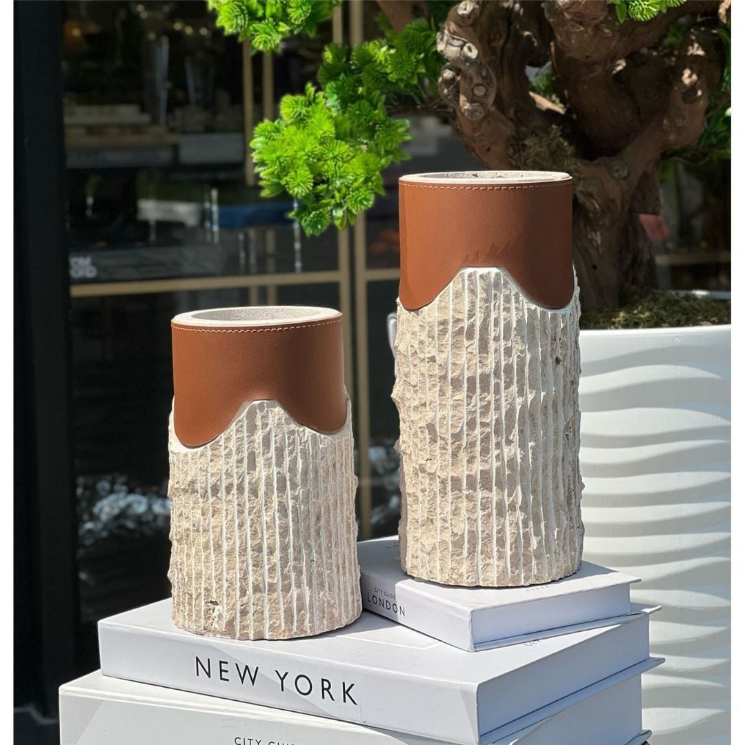 Dekoratif 3'lü Deri Kaplı Vazo - Taba