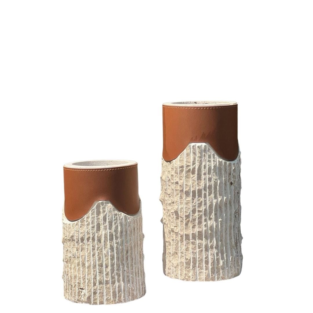 Traverten Derili Vazo SetiÜrün AçıklamasıTraverten Derili Vazo Seti, doğal güzelliği ve zarafeti bir araya getiren göz alıcı bir dekoratif parçadır.  her türlü çiçek aranjmanınızı estetik bir şekilde sergilemenizi sağlar. Yüksek kaliteli malzemelerden üretilmiş olup, iç mekan dekorasyonunuzda sofistike bir dokunuş yaratır. Modern ve şık tasarımıyla evinizin her köşesinde fark yaratır.Malzeme:traverten / deriKutu i̇çeriği:2 adet