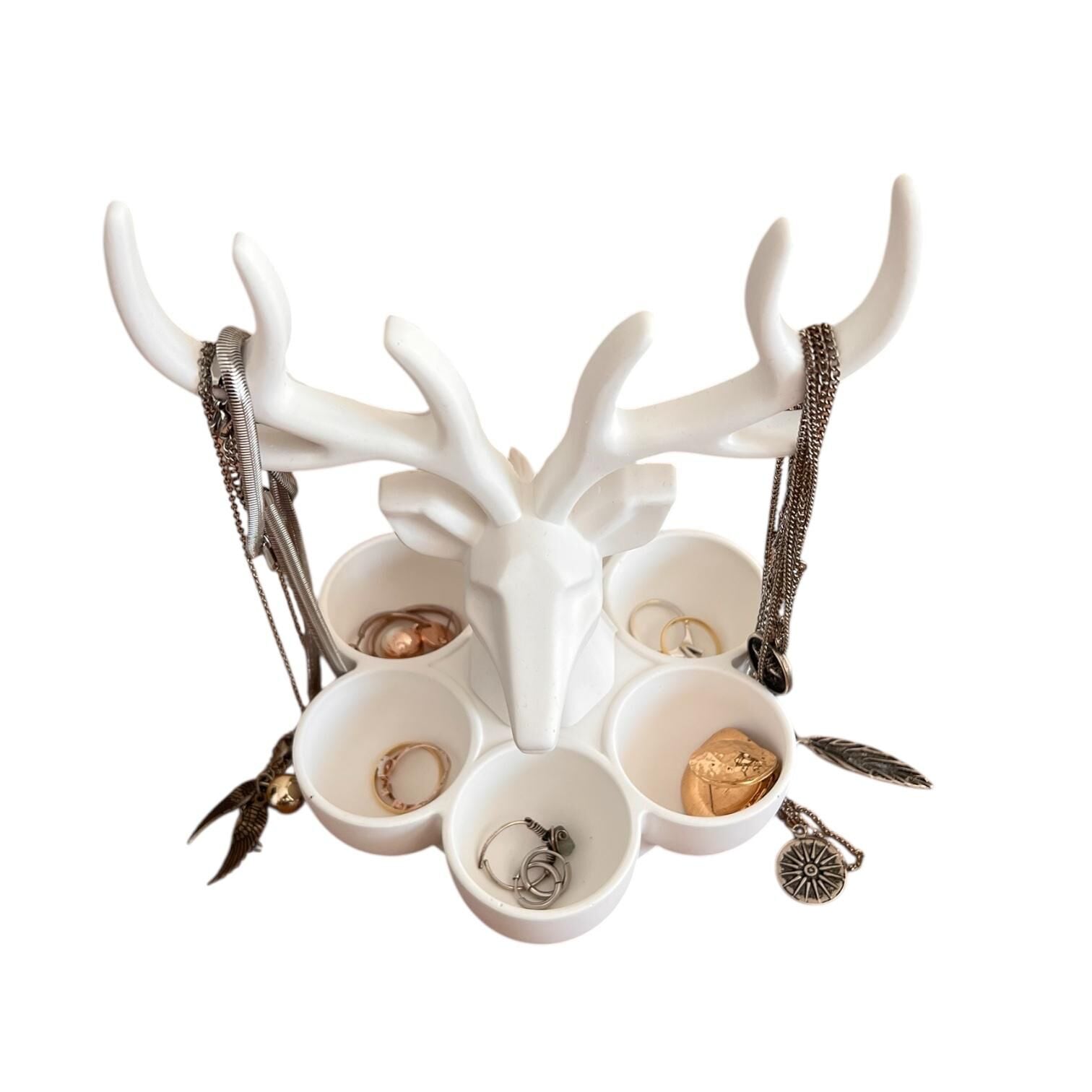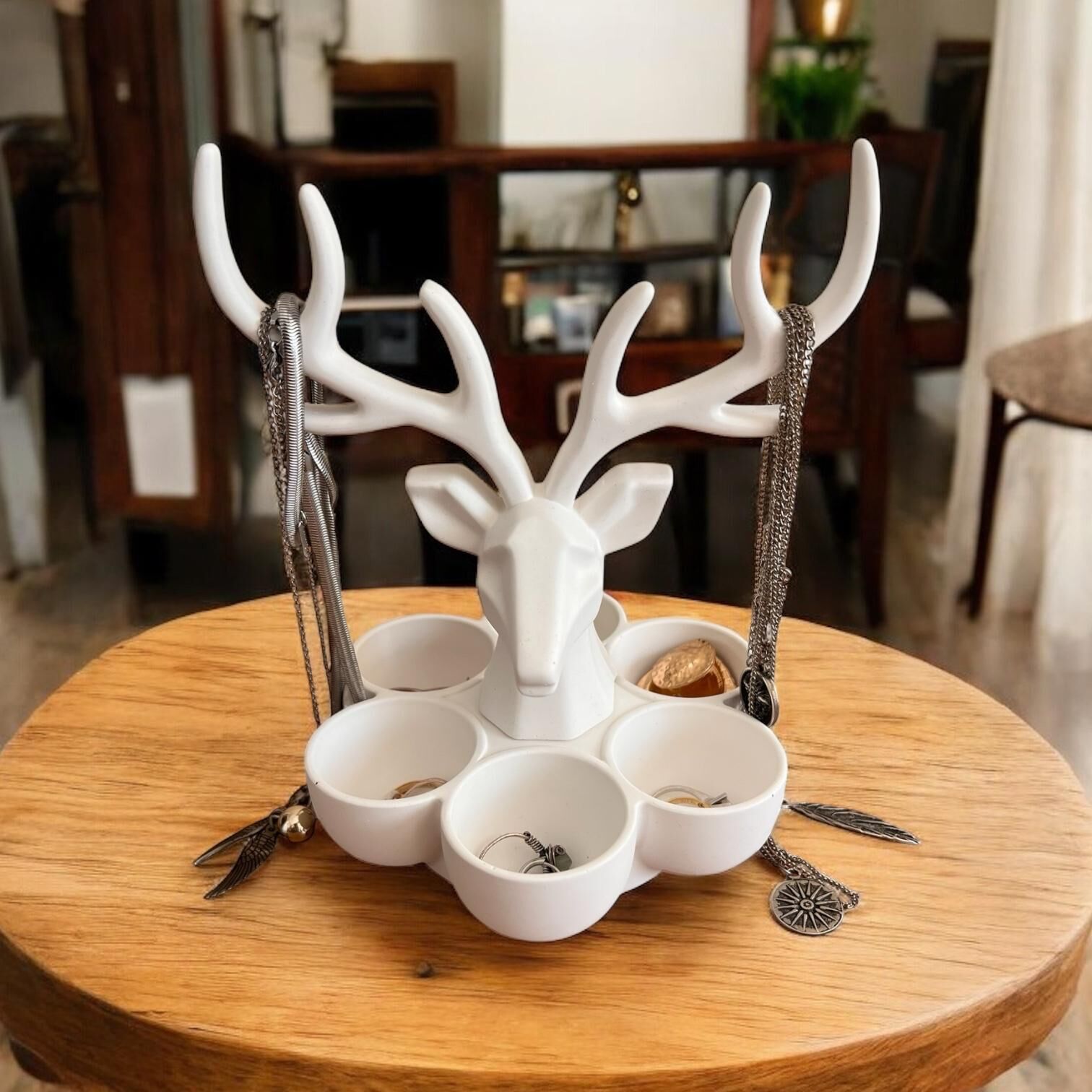 Denfix Geyik Organizer | Sıcak Beyaz Denfix Geyik Organizer | Sıcak Beyaz, doğadan ilham alan zarif bir takı organizeridir. Geyik başı formu ve boynuz askılıklarıyla kolyelerinizi sergilerken, alt bölmeleriyle yüzük ve küpelerinize düzen katar. El yapımı DENFİX malzeme dokusuyla estetik ve işlevselliği bir araya getirir.Ürün Ölçüleri:Ürün ölçüleri: 15 cm x 19 cm * Denfix yapısı gereği seramik tınısı verir ve elde boya veya iz bırakmaz. Not: Ürünlere sıvı teması uygun olmayıp nemli bez ile temizlemeye uygundur.Not: Geyik ve altuındaki stand birleşik değildir.