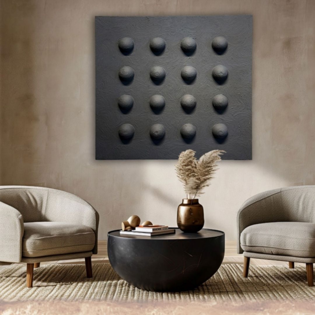 Ukyco Yağlı Boya Top Tablo - Siyah Ukyco Yağlı Boya Top Tablo – Siyah, ressamlarımız tarafından tamamen el yapımı tekniklerle oluşturulmuş, yağlı boya dokusu ile farklı materyallerin birleşiminden oluşan üç boyutlu bir duvar sanat eseridir. Siyahın güçlü ve modern etkisi, mekâna derinlik katan dramatik bir atmosfer yaratır. Ürün Özellikleri Her tablo benzersizdir ve el işçiliğinin detaylı dokusunu taşır. Üç boyutlu yüzey yapısı, ışıkla birlikte değişen etkileyici bir görünüm oluşturur. Modern, minimal ve lüks dekorasyon stillerine uyum sağlamak üzere tasarlanmıştır. Ölçüler Ebat: 100 × 100 cm Üretim Süresi Ürün tamamen el yapımı olduğu için hazırlık süresi bulunmaktadır. Ürün 2 hafta terminlidir. Kullanım Alanları Siyahın güçlü etkisi sayesinde salon, oturma odası, ofis, modern lobiler, giriş alanları ve butik dekorasyon alanlarında iddialı bir duvar sanatı olarak kullanılabilir. Hem modern hem endüstriyel dekorasyonlarla kusursuz uyum sağlar.