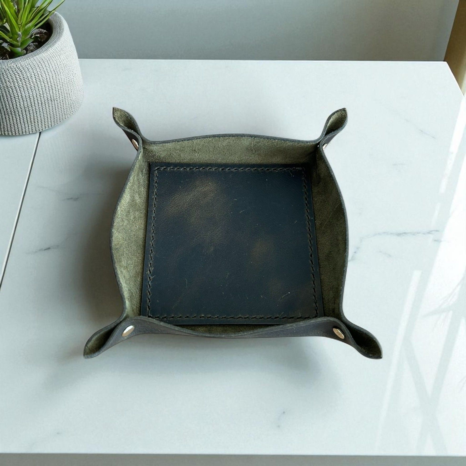 Catchbowl | Deri Organizer - Oliv Masanızda düzenin şıklıkla buluştuğu nokta: Catchbowl | Deri Organizer - Taba. El yapımı ve %100 hakiki deriden üretilen bu şık organizer, anahtar, bozuk para, yüzük, saat gibi küçük eşyalarınızı derli toplu tutarken estetik görünümüyle bulunduğu ortama karakter katar. İster evinizin girişinde, ister ofis masanızda kullanın; Catchbowl yaşam alanınıza doğal ve zamansız bir dokunuş getirir. • El işçiliği ve kaliteli dikiş getayları • Katlanabilir köşeler sayesinde pratik kullanım • Minimalist, fonksiyonel ve uzun ömürlü tasarım • Masa üstü için ideal boyut • Hem ev hem ofis kullanımına uygun Ürün Ölçüleri; 14 cm x 14 cm
