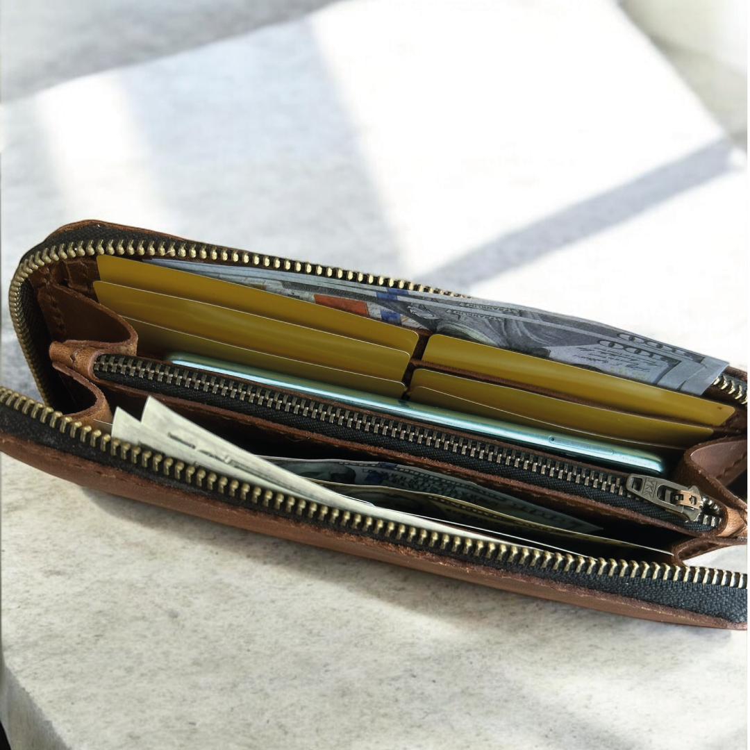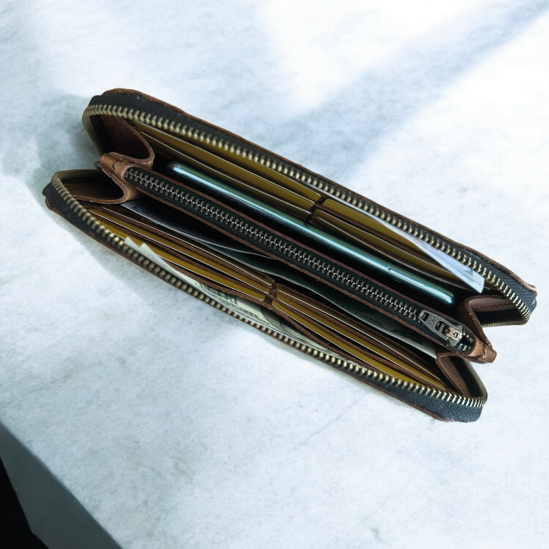 Zyra | Partik Fermuarlı Cüzdan Zyra | Partik Fermuarlı Cüzdan, fonksiyonelliği ve zarafeti bir araya getiriyor. Hakiki deriden el işçiliğiyle üretilen bu partik fermuarlı cüzdan, kartlarınız, nakitleriniz ve küçük eşyalarınız için geniş ve organize bir alan sunar. Tam açılabilen yapısı ve çoklu bölmeleriyle günlük kullanımda pratiklik sağlar. Taba rengin şıklığıyla stilinize doğal bir dokunuş katar. • 12 adet Kart Bölmesi • 1 adet Fermuarlı Bozuk Para Bölmesi • 1 adet Telefon Bölmesi • 3 adet Nakit Para Bölmesi Ürün Ölçüleri; 22 cm x 21 cm