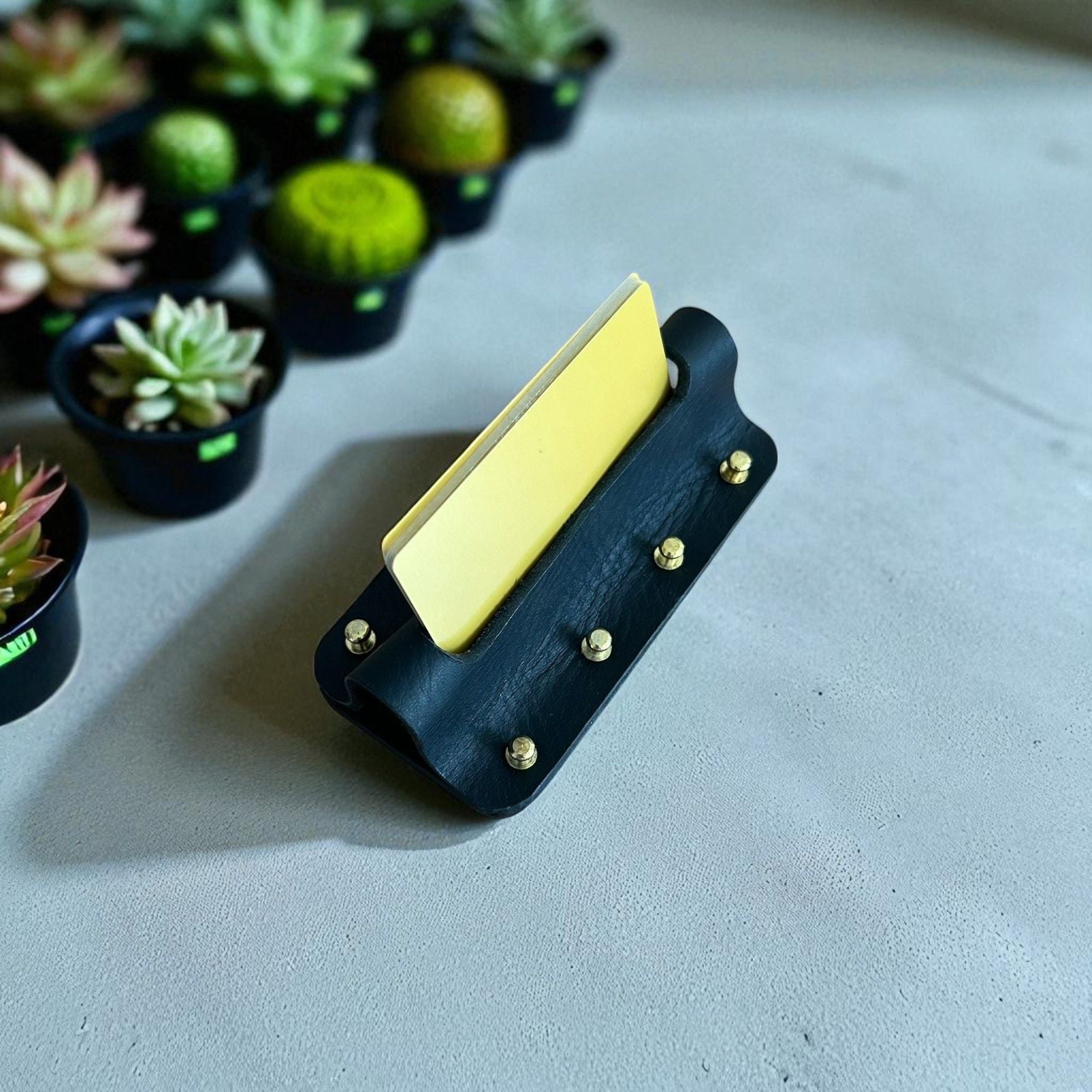 Cardo | Hakiki Deri Ofis Kartvizitliği - Siyah Cardo | Hakiki Deri Ofis Kartvizitliği - Siyah, masaüstü düzenini şıklıkla buluşturan el yapımı deri kartvizitliktir. Hakiki deri yapısı, zarif pirinç detayları ve zamansız tasarımıyla ofisinizde fark yaratır. Kartvizitlerinizi şık bir şekilde sergileyin, ilk izlenimi güçlendirin. El işçiliğiyle üretilmiş olup, her detayında kalite hissini taşır. Masanıza estetik bir dokunuş eklemek için ideal bir aksesuardır. ÜRÜN ÖLÇÜLERİ; 12 cm x 6 cm