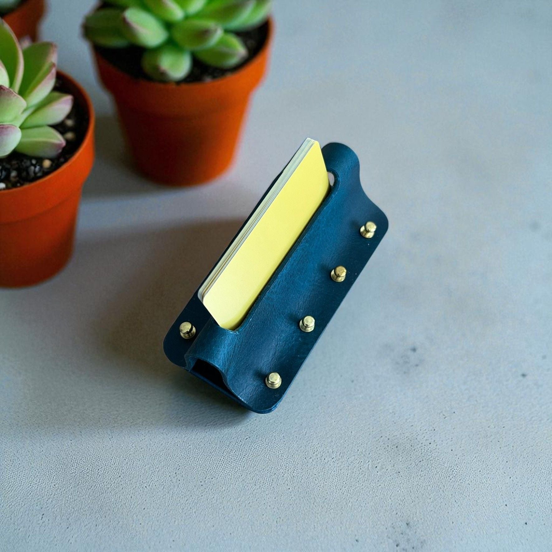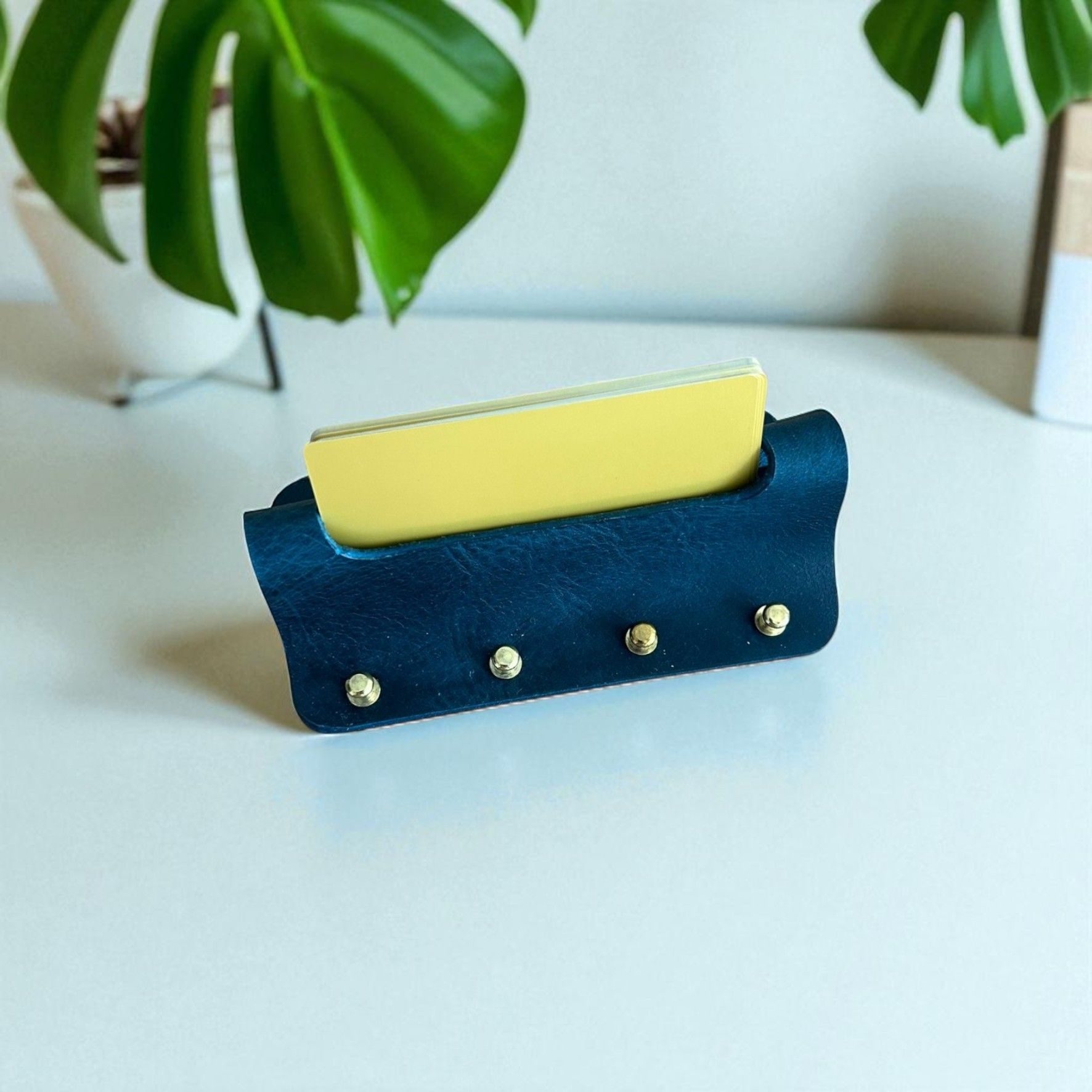 Cardo | Hakiki Deri Ofis Kartvizitliği - Mavi Cardo | Hakiki Deri Ofis Kartvizitliği - Mavi, masaüstü düzenini şıklıkla buluşturan el yapımı deri kartvizitliktir. Hakiki deri yapısı, zarif pirinç detayları ve zamansız tasarımıyla ofisinizde fark yaratır. Kartvizitlerinizi şık bir şekilde sergileyin, ilk izlenimi güçlendirin. El işçiliğiyle üretilmiş olup, her detayında kalite hissini taşır. Masanıza estetik bir dokunuş eklemek için ideal bir aksesuardır. ÜRÜN ÖLÇÜLERİ; 12 cm x 6 cm