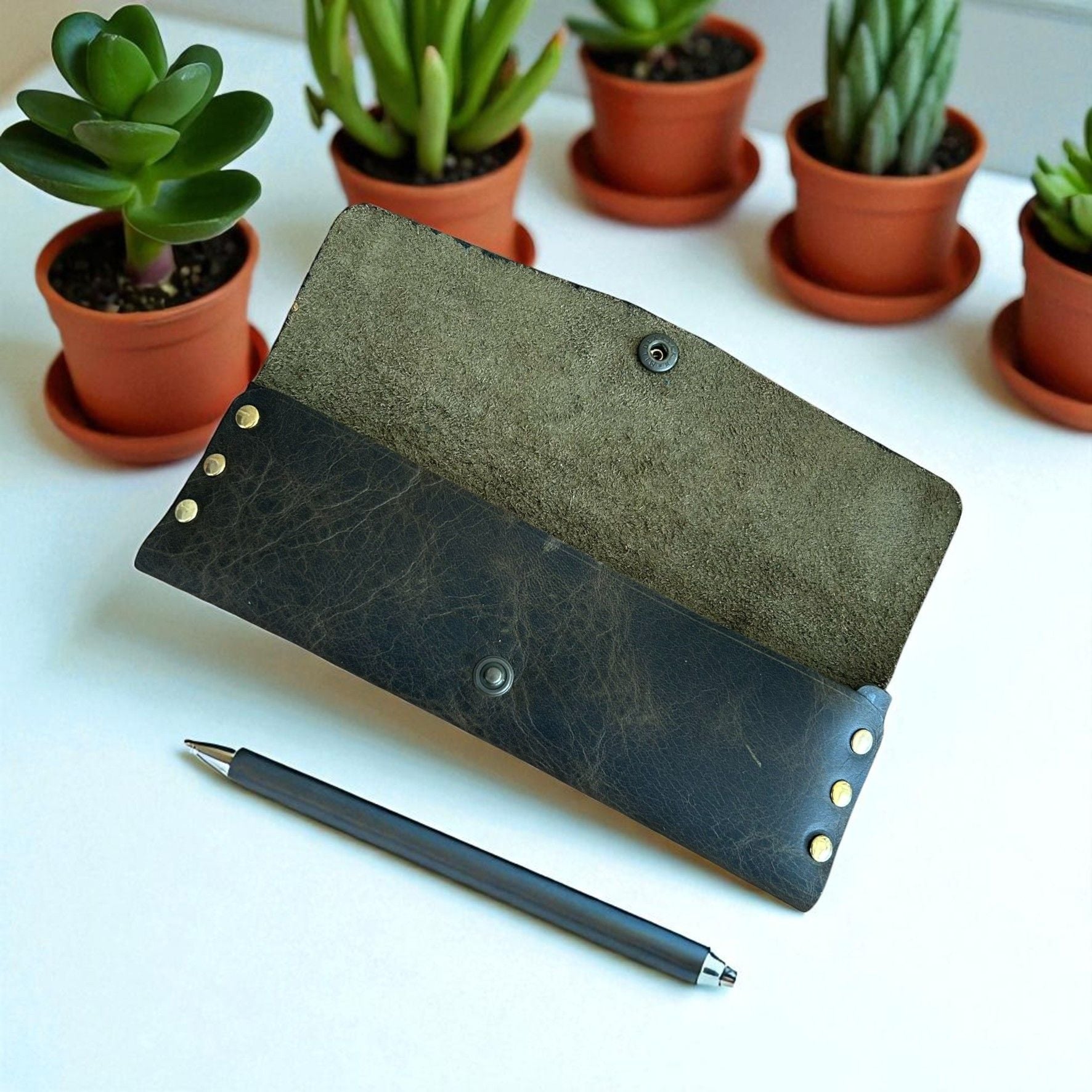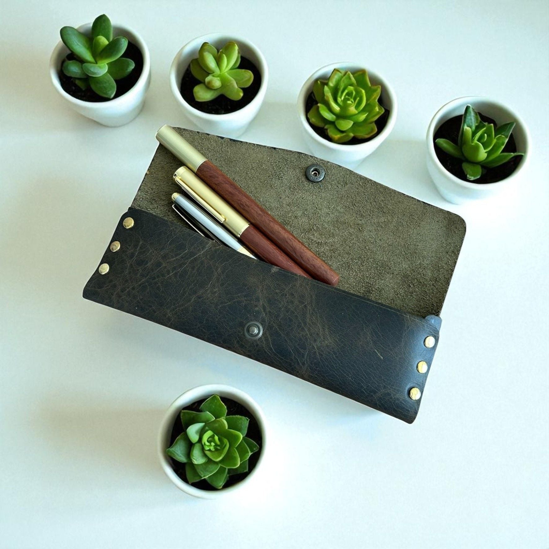 Stilo | Deri Perçinli Kalem Kutusu - Olive