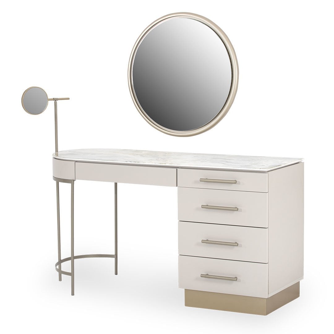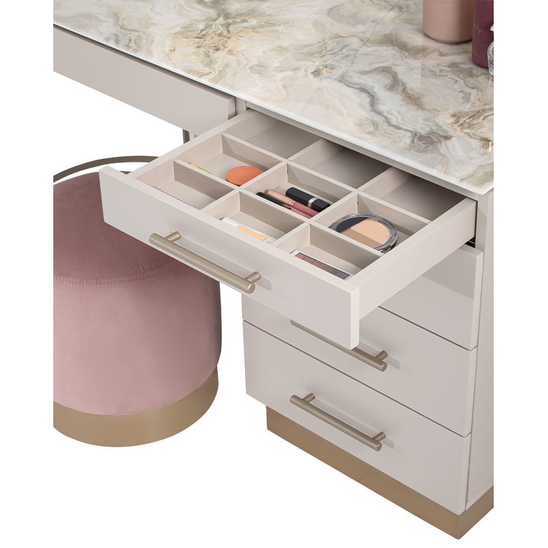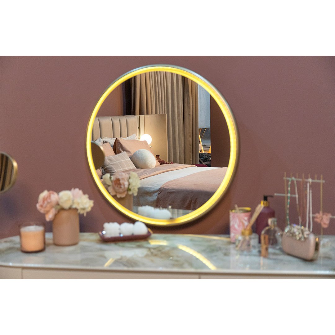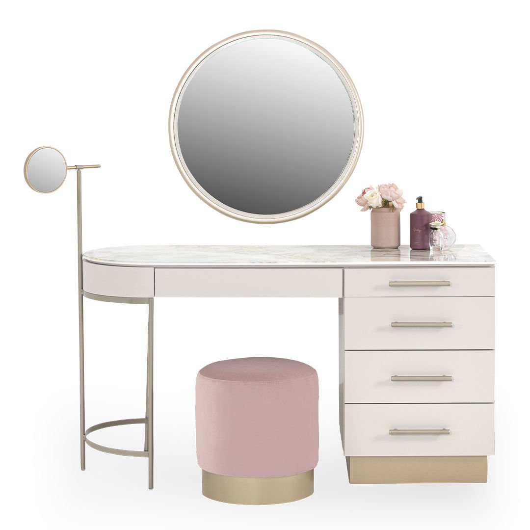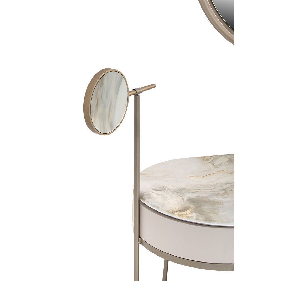 Dairesel formları metalik detaylarla birleştiren Blush Şifonyer, yaşam alanlarına zarafeti ve şıklığı getirmeyi amaçlıyor. Hayatı kolaylaştırırken sadeliği ile de iç mekanlara ışıltı katıyor.Ürün Tanımı: Blush Şifonyer.   Üst Tabla Malzemesi: Dijital görselleştirilmiş mdf malzemeden üretilmiştir.   Şifonyer Malzemesi: Grej ipek mat lake mdf malzemeden üretilmiştir, şifonyer kulpları ve ayna çerçevesi metalik kum beji elektrostatik boyalı metal malzemeden üretilmiştir.   Ayak Malzemesi: Boyalı mdf malzemeden üretilmiştir.   ÖNEMLİ BİLGİLENDİRME: AYNA ŞİFONYER FİYATINA DAHİLDİR!  Bakım: Ilık sabunlu su yardımıyla temizlenebilmektedir.   Genişlik: 140 cm    Derinlik: 53 cm    Yükseklik: 112 cm