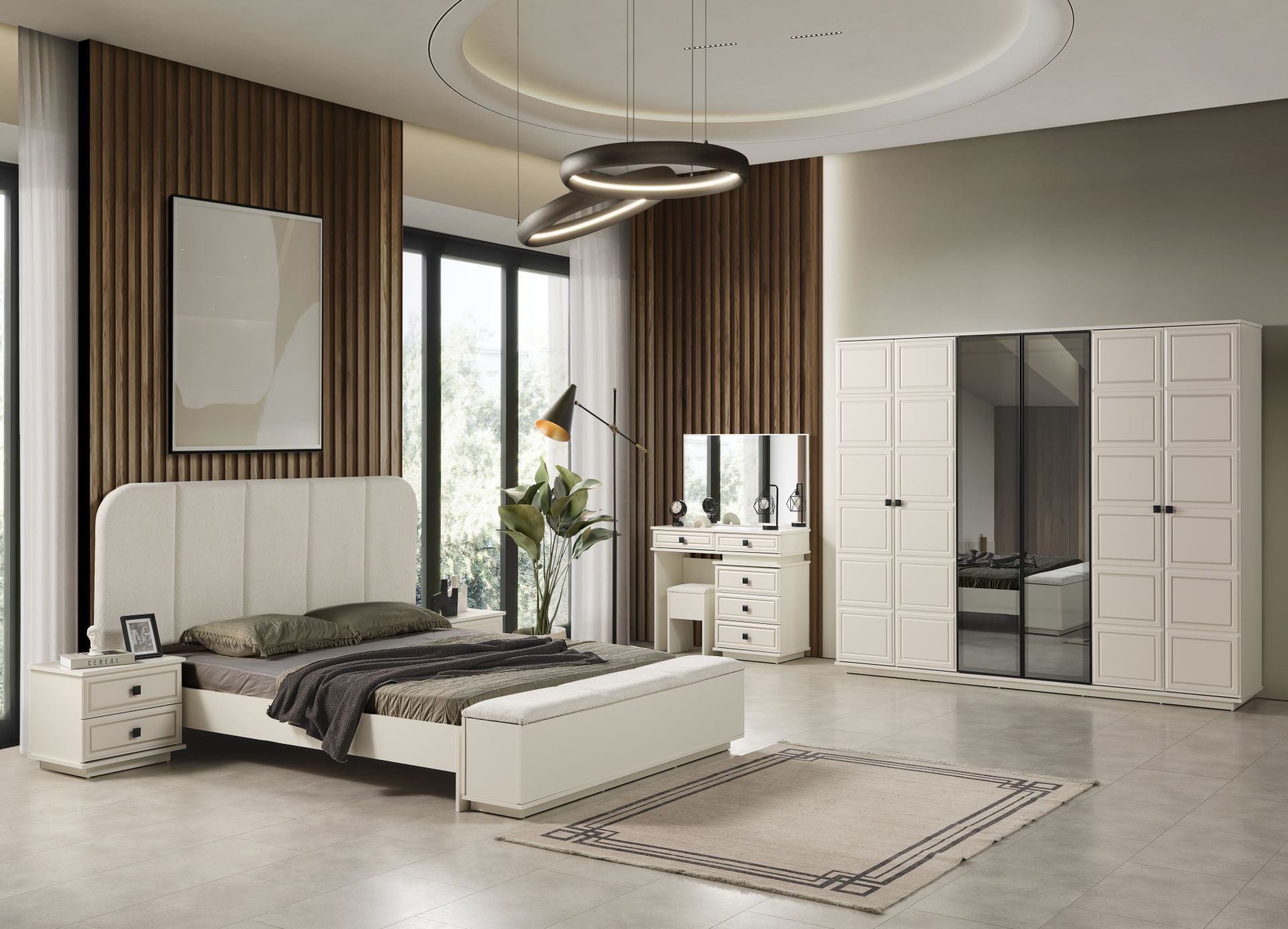 Takım İçeriği 1 Adet 6 Kapaklı Gardırop, 1 Adet Şifonyer Gövde, 1 Adet Şifonyer Ayna, 1 Adet Şifonyer Puf, 2 Adet Komodin, 1 Adet Panolu Karyola, 1 Adet Karyola Sandıklı Bench, 1 Adet Kendinden Baza