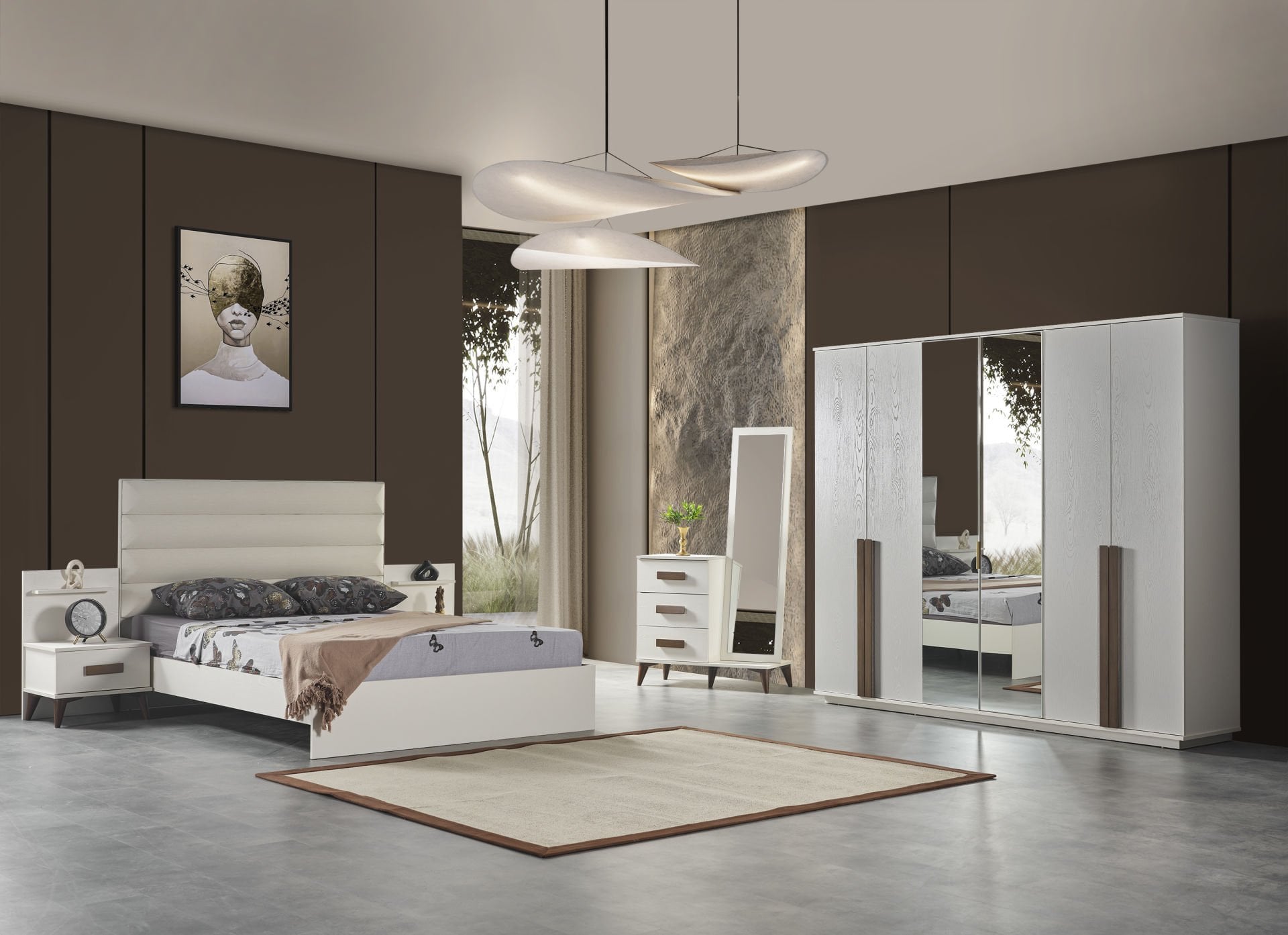 | Takım İçeriği | 1 Adet 6 Kapaklı Gardırop, 1 Adet Şifonyer Gövde, 1 Adet Şifonyer Ayna, 2 Adet Komodin,1 Adet Panolu Karyola, 1 Adet Kendinden Baza |
