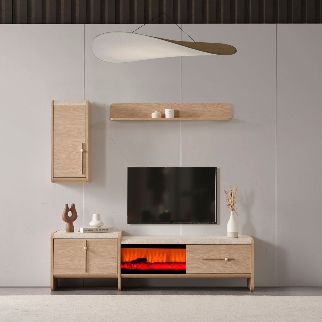 | Ürün İçeriği | 1 Adet Şömineli TV Sehpa, 1 Adet TV Üst Yan Blok, 1 Adet TV Üst Raf |