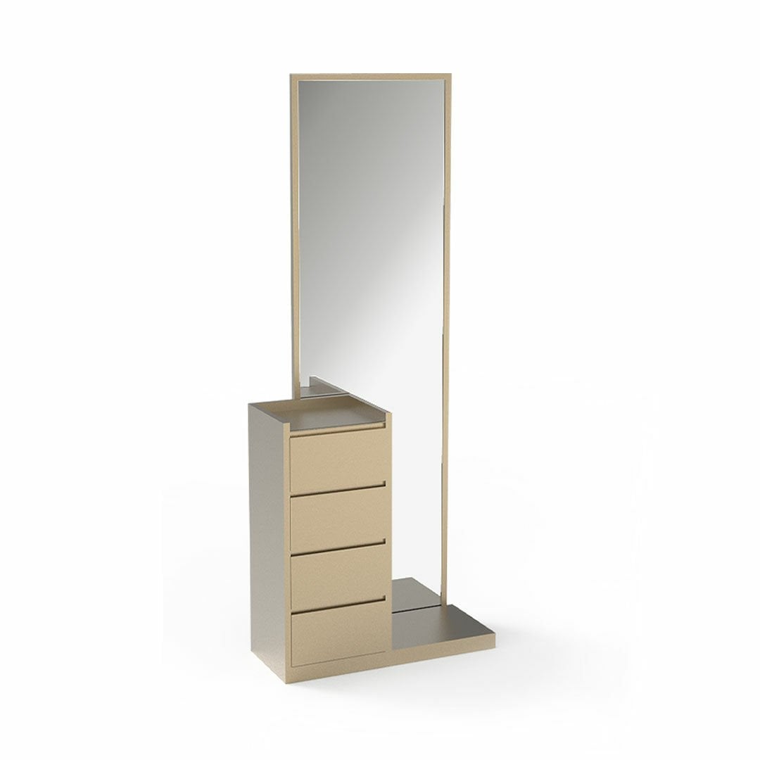 Lapis yatak odası modern ve yalın hatlarıyla mekanlarınız için konfor sağlamak amacıyla tasarlanmıştır. Kübik hatların hakim olduğu takım, deri döşemeli bazalı karyolası, şifonyer aynasında bulunan hareket mekanizması ve Işık detayı ile konfor alanınızı daha keyifli kılıyor. Bronz ayna ve pirinç detaylarıyla zenginleşen lapis, yaşam alanınızda sade ve şık bir aura yaratmayı amaçlıyor. Kırık beyaz ve vizon renk seçenekleriyle evlerinizde yerini almaya hazırlanıyor.Ürün Tanımı: Lapis Boy Aynası.   Ürün Malzemesi: Ayna çerçevesi ve çekmece metalik kum beji boyalı lake malzemeden üretilmiştir.Bakım: Ilık sabunlu su yardımıyla temizlenebilmektedir.    Genişlik: 69 cm    Derinlik: 37 cm    Yükseklik: 180 cm