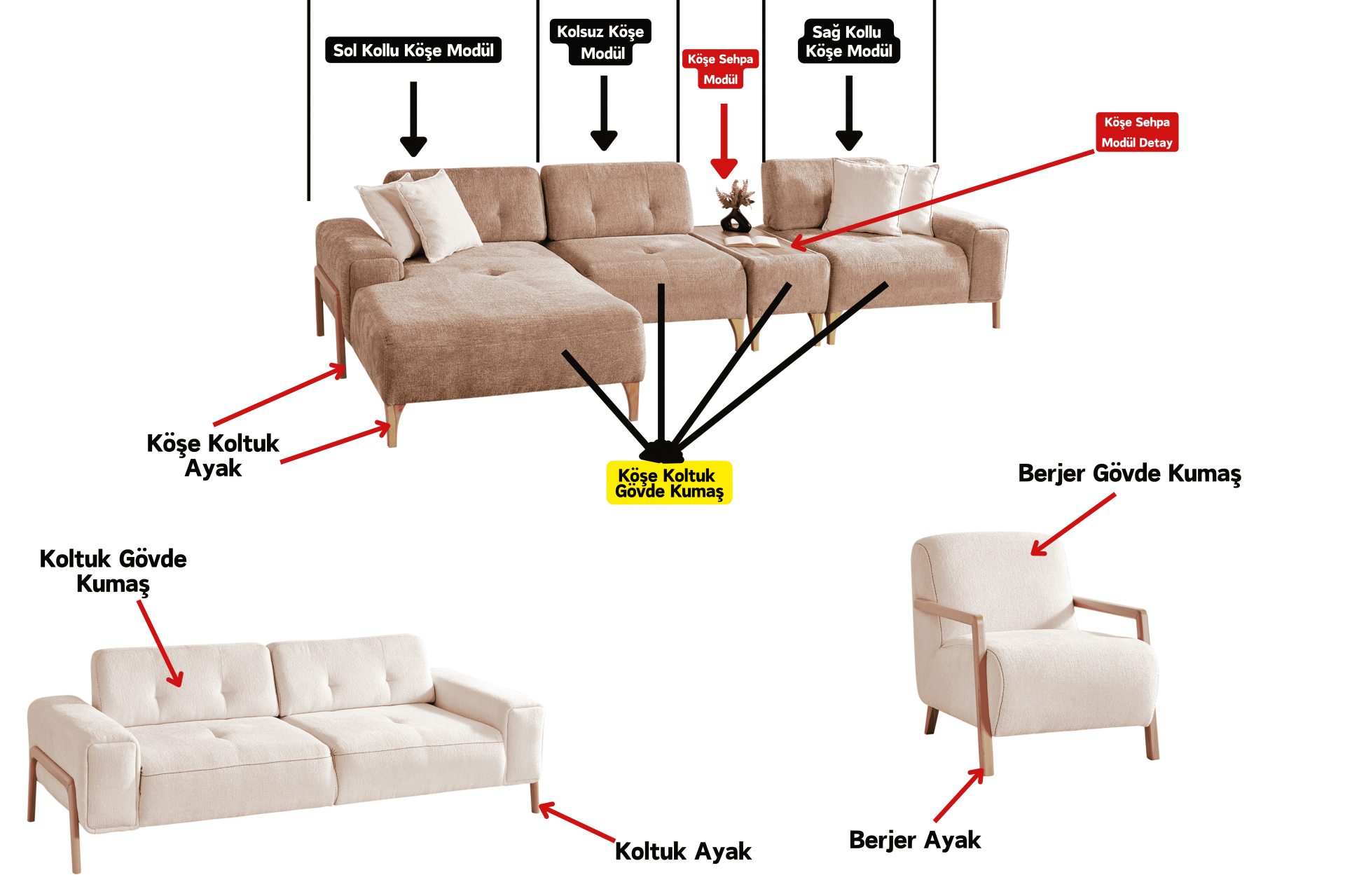 | Takım İçeriği | 1 Adet Üçlü Koltuk, 1 Adet Berjer, 1 Adet Sağ Kollu Köşe Modül, 1 Adet Sol Kollu Köşe Dinlenme Modül, 1 Adet Kolsuz Köşe Modül, 1 Adet Köşe Sehpa Modül, 6 Adet Kare Kırlent |