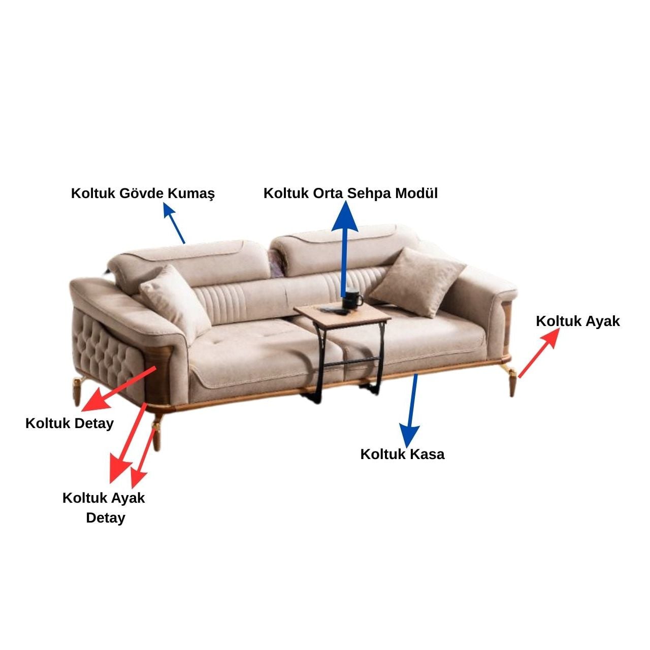 | Koltuk Orta Sehpa Malzemesi | * Gövde Kısımlarında 1.Sınıf Kaliteli Metal Kullanılmıştır. * Üst Tablo Kısımlarında 1.Sınıf Kaliteli MDF Kullanılmıştır. |