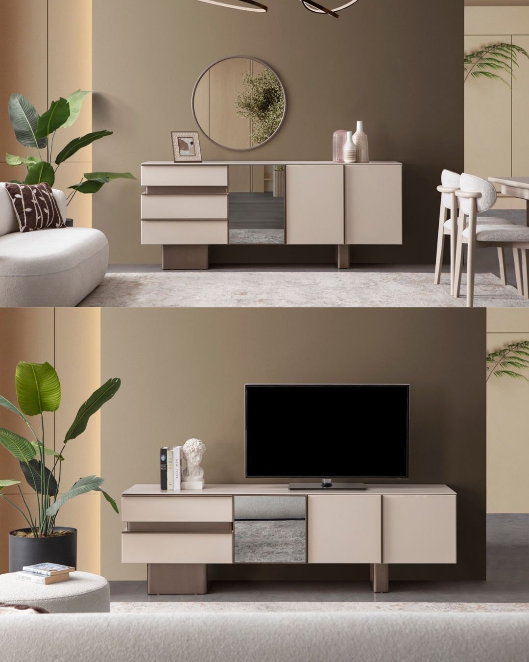 | Yemek Odası Takımı Fonksiyonu | * Konsol Fonksiyonu: 3 Kapaklı + 3 Çekmecelidir. * Tv Ünitesi Fonksiyonu: 3 Kapaklı + 2 Çekmecelidir. * Masa Fonksiyonu: Açılırdır. |