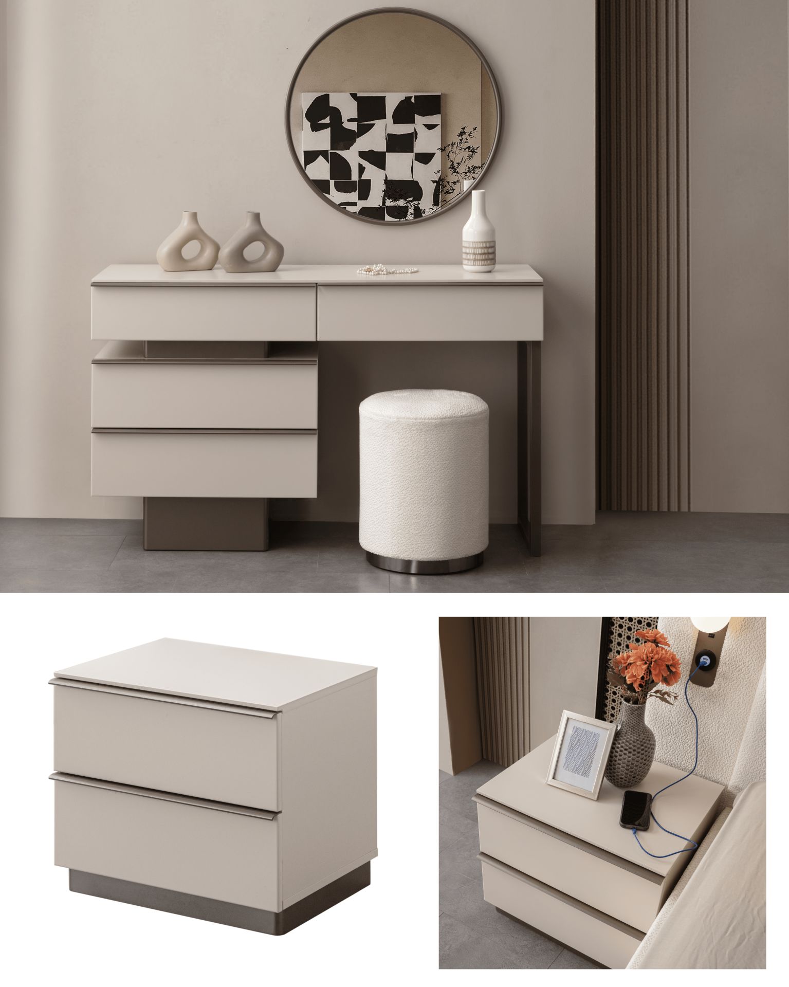 | Yatak Odası Takımı Özellikleri | * Gardırop: Gardırop İçinde Askılık, Yüklük, Pantolonluk Ve Gardırop İçi 3 Çekmeceli Düzenleyici Mevcuttur. + Gardırop İçlerinde Aydınlatma Özelliği Vardır. + Gardırop Aydınlatması Pilden Güç Almaktadır. * Şifonyer: Takı Ve Aksesuar Koyma Alanı Mevcuttur. * Panolu Karyola: Karyola Başlığında 2 Adet Tuşlu Gece Lambası Bulunmaktadır. + USB Şarj Sistemi Bulunmaktadır. + Karyola Aydınlatması Ve USB Şarj Alanı Prizden Güç Almaktadır. |