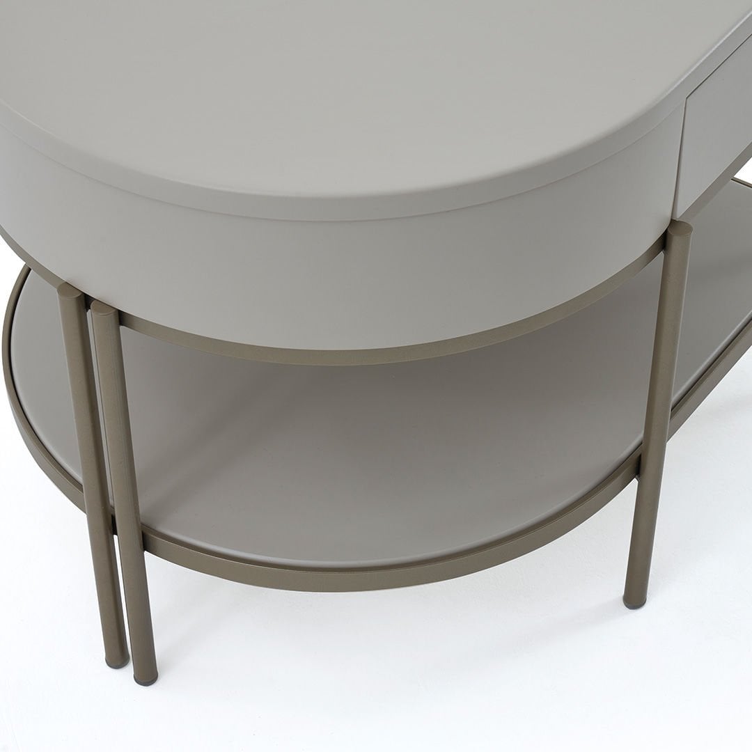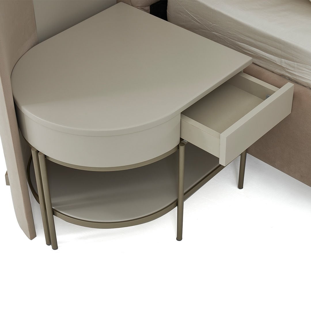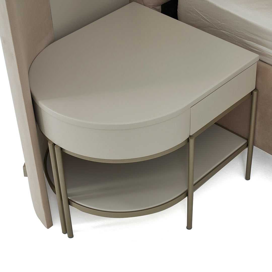 Dairesel formları geometrik detaylarla birleştiren Blush Komodin yaşam alanlarına zarafeti ve şıklığı getirmeyi amaçlıyor. Hayatı kolaylaştırırken sadeliği ile de iç mekanlara ışıltı katıyor.Ürün Tanımı: Blush Komodin.   Ürün Malzemesi: Lake mdf malzemeden üretilmiştir.   Ayak Malzemesi: Metalik kum beji elektrostatik boyalı metal malzeme kullanılmıştır.Bakım: Ilık sabunlu su yardımıyla temizlenebilmektedir.   Genişlik: 56 cm    Derinlik: 56 cm    Yükseklik: 47 cm