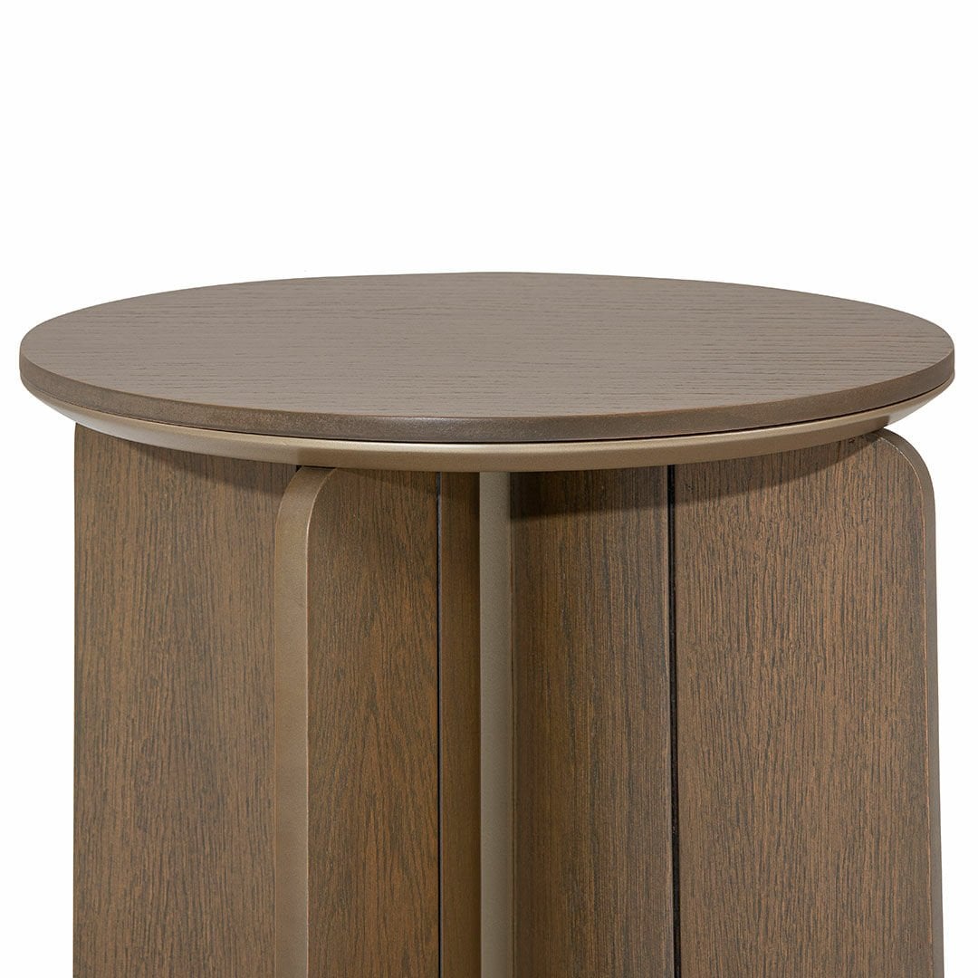 Nefes alan mekanlar yaratmak için tasarlanmış Apricot koleksiyonu dairesel ve çizgisel hatlı formlardan ilham almıştır. Doğal renklerde kullanılan ahşabın pastel tonlardaki metal materyalle uyumu kullanılacak mekana fark yaratıcı bir dinginlik ve derinlik yaratır. Ürün Tanımı: Apricot Yan Sehpa.   Üst Tabla Malzemesi: Sehpa modeli isli meşe doğal ahşap kaplama malzemeden üretilmiştir.   Ürün Formu: Sehpa yuvarlak formdadır.   Bakım: Ilık sabunlu su yardımıyla temizlenebilmektedir.   Genişlik: 50 cm    Derinlik: 50 cm   Yükseklik: 53 cm