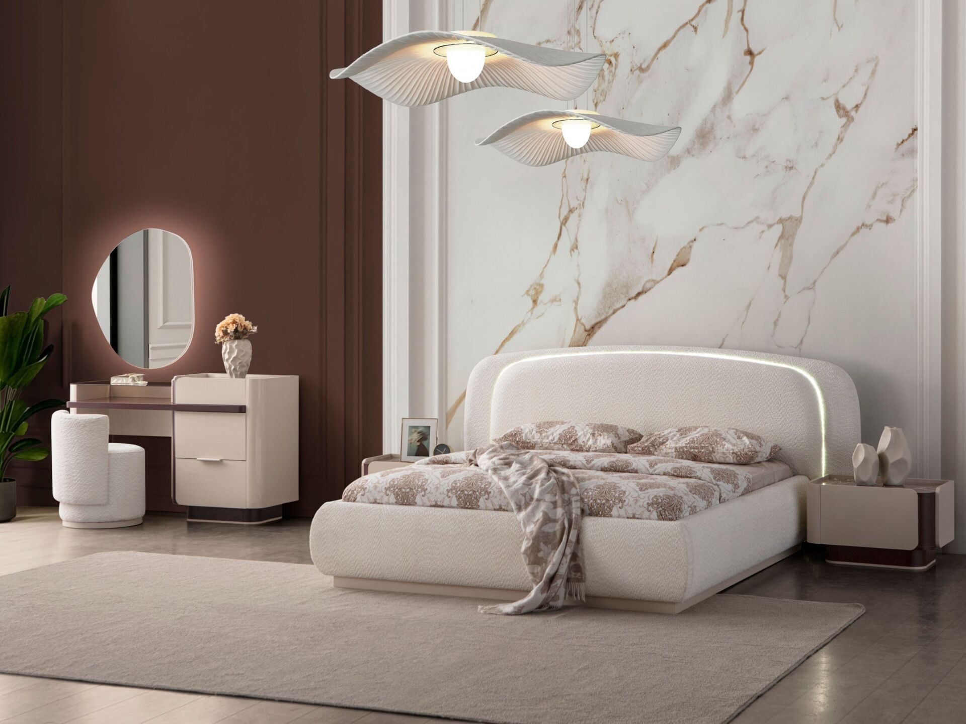 Şifonyer üst tablası camdır. Bu camlı bölme ziynet bölmesinin teşhiri olarak tasarlanmıştır. 3 adet çekmeceye sahiptir. Çekmeceli bölme üzerindeki tabla mermer desen baskılıdır. Çekmeceler ray ve yavaşlatıcı kullanılarak imal edilmiştir. Dekoratif ayna LED aydınlatmalıdır. Mukavemete ve çizilmeye dayanıklıdır. Ayaklar ahşap malzemedir. Komodinlerin dış yüzeyleri MDF malzemedir. Üst tabla mermer desen baskılı olarak üretilmiştir. 1 adet çekmeceye sahiptir. Komodinler ahşap ayaklı olarak imal edilirler. Ürünü modüler olarak ayrı ayrı satın alabilirsiniz. Ürün ölçü ve renk seçeneklerinde değişim arzu ederseniz lütfen talebinizi ürünü satın almadan önce müşteri temsilcimize iletiniz. Ölçü ve renk değişimi her ürün için mümkün olmayabilir.
