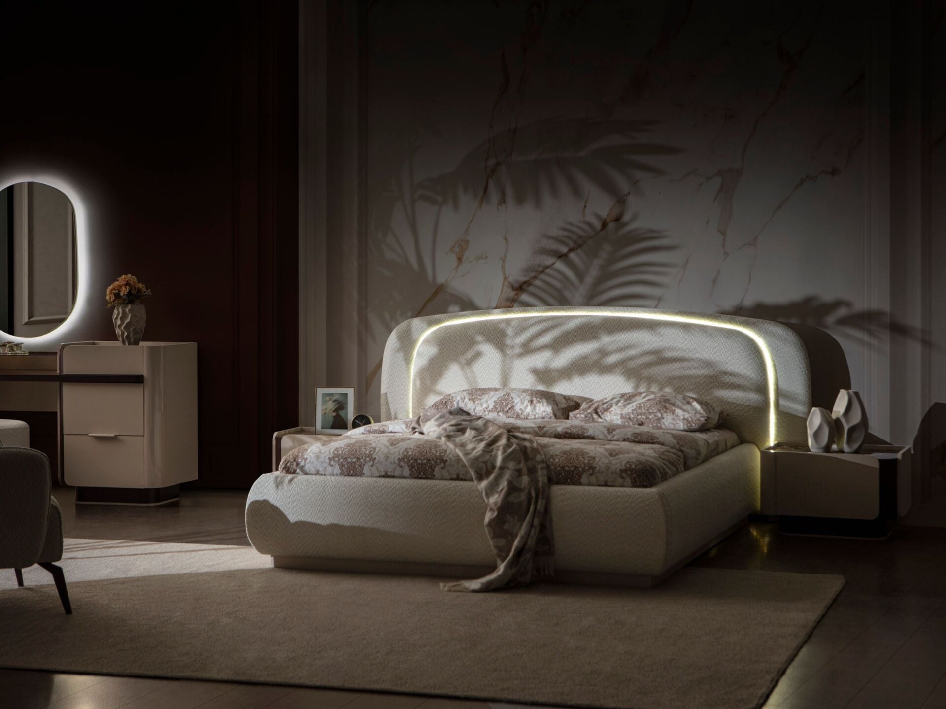 Ürün başlıklı bazalı karyola biçimindedir. Başlık ve karyola çerçevesi sünger üzeri kumaş kaplıdır. Başlık ve karyola çerçevesi yonga-levha malzemedir. Karyola başlığı LED ambiyans aydınlatmalıdır. Gece lambasına lüzum bırakmayacak aydınlığa sahiptir. Baza fonksiyonel olarak bölümlendirilmiştir.