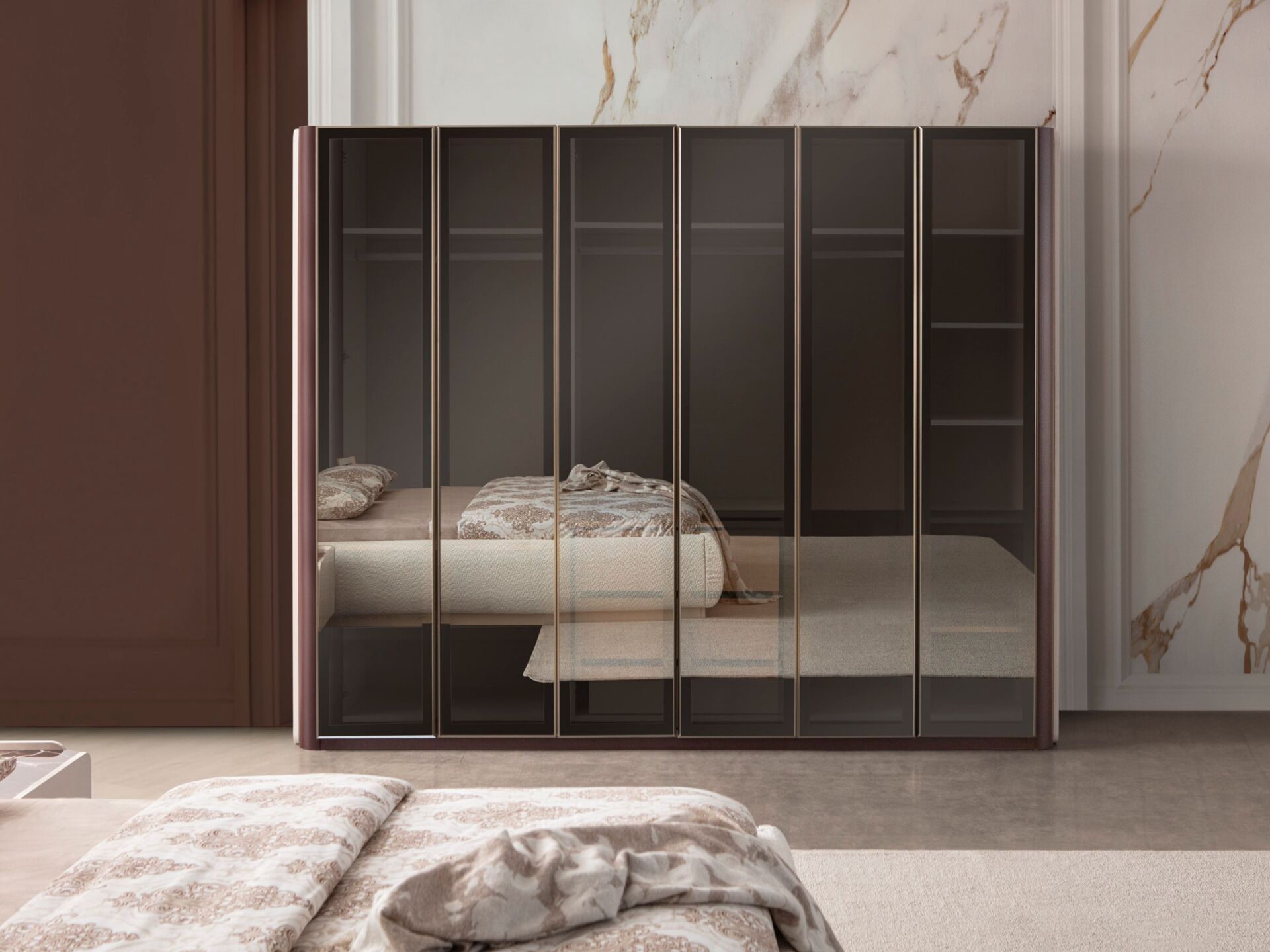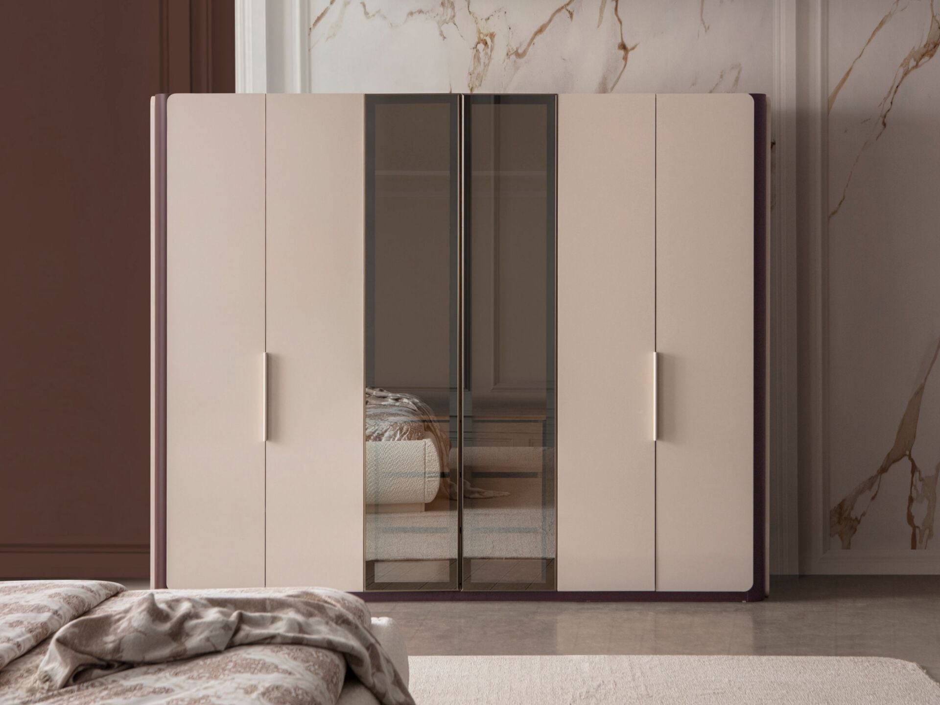 Dolap bir bütün şeklinde imal edilmektedir. Ahşap kapaklar ve dış görünür yüzeyler 1. sınıf suntelam malzemeden imal edilmiştir. Ahşap kapaklar yeni nesil renk kaplama olarak üretilmiştir. Kabarma ve solma görülmez. Yan yüzeyler de aynı renktedir. Orta modüller cam kapaklıdır. Aynı şeklide dışarı bakan tarafları da cam çerçeveli olarak imal edilmiştir. Camlı olan kısımlar aynı zamanda LED aydınlatmalıdır. İç bölmede raylı çekmeceler yer alır. İsteğe göre dolabın tüm kapakları camlı olarak üretiledebilir.