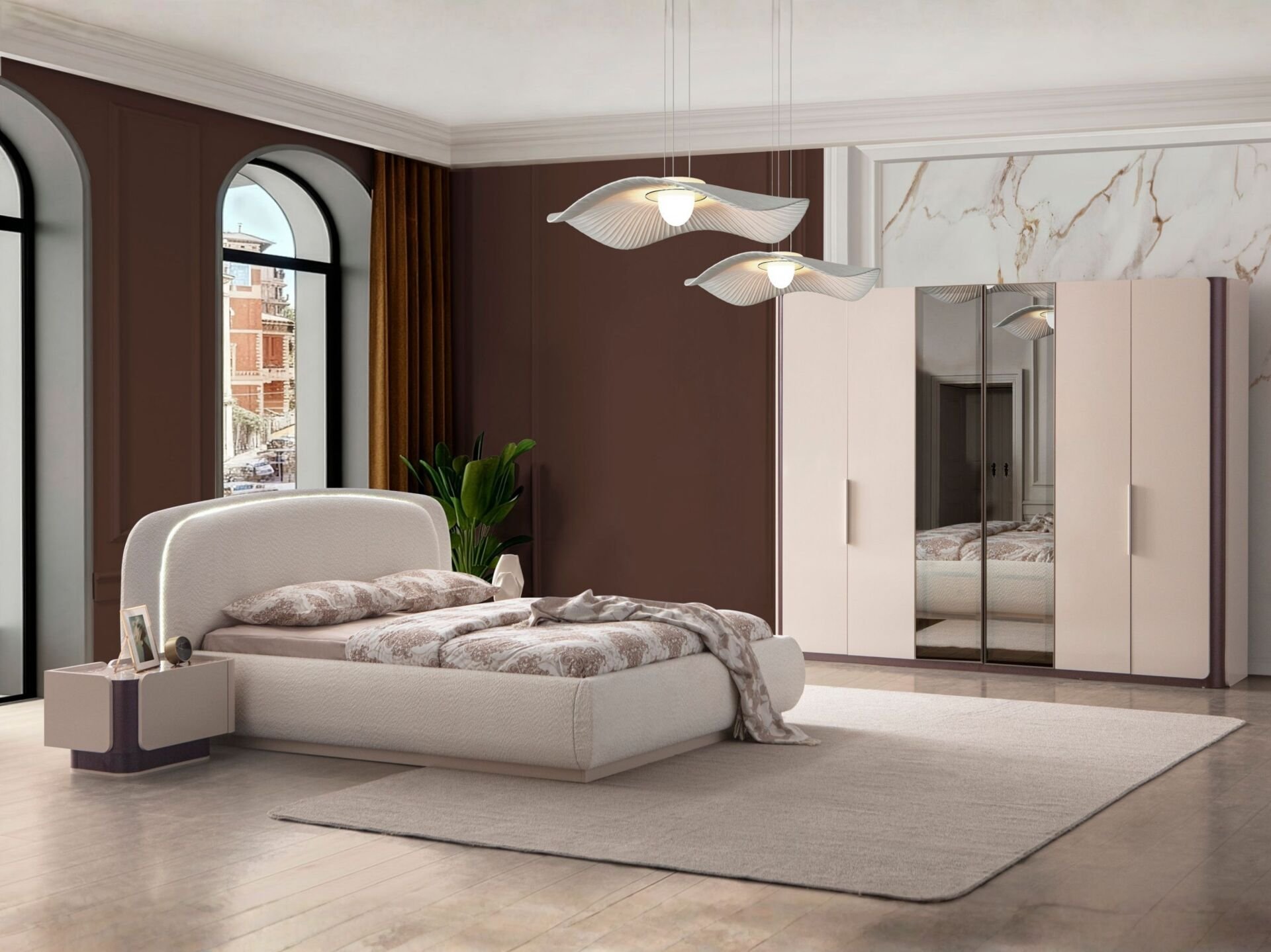 Takım standart içeriği 1 adet 6 kapaklı gardırop, 1 adet başlıklı bazalı karyola, 1 adet aynalı şifonyer, 2 adet komodinden müteşekkildir.