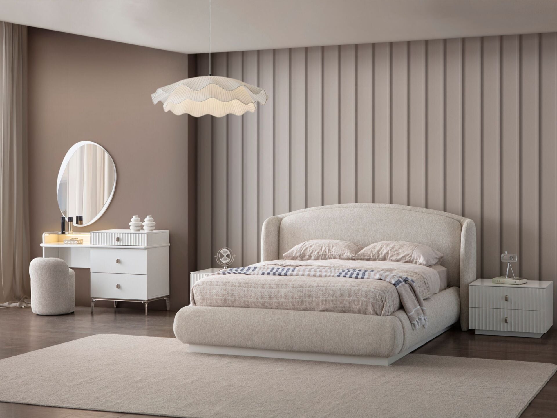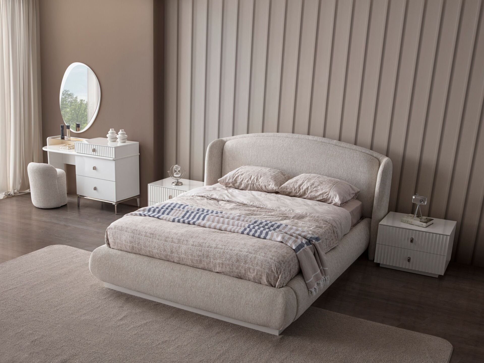 Takım standart içeriği 1 adet 6 kapaklı gardırop, 1 adet başlıklı bazalı karyola, 1 adet aynalı şifonyer, 2 adet komodinden müteşekkildir.