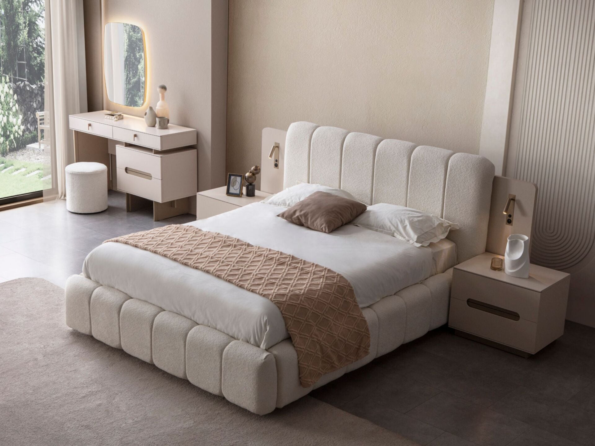 Başlık üzeri ve karyola çerçevesi kolay silinebilir, pamuklu şönil kumaşla bezenmiştir.