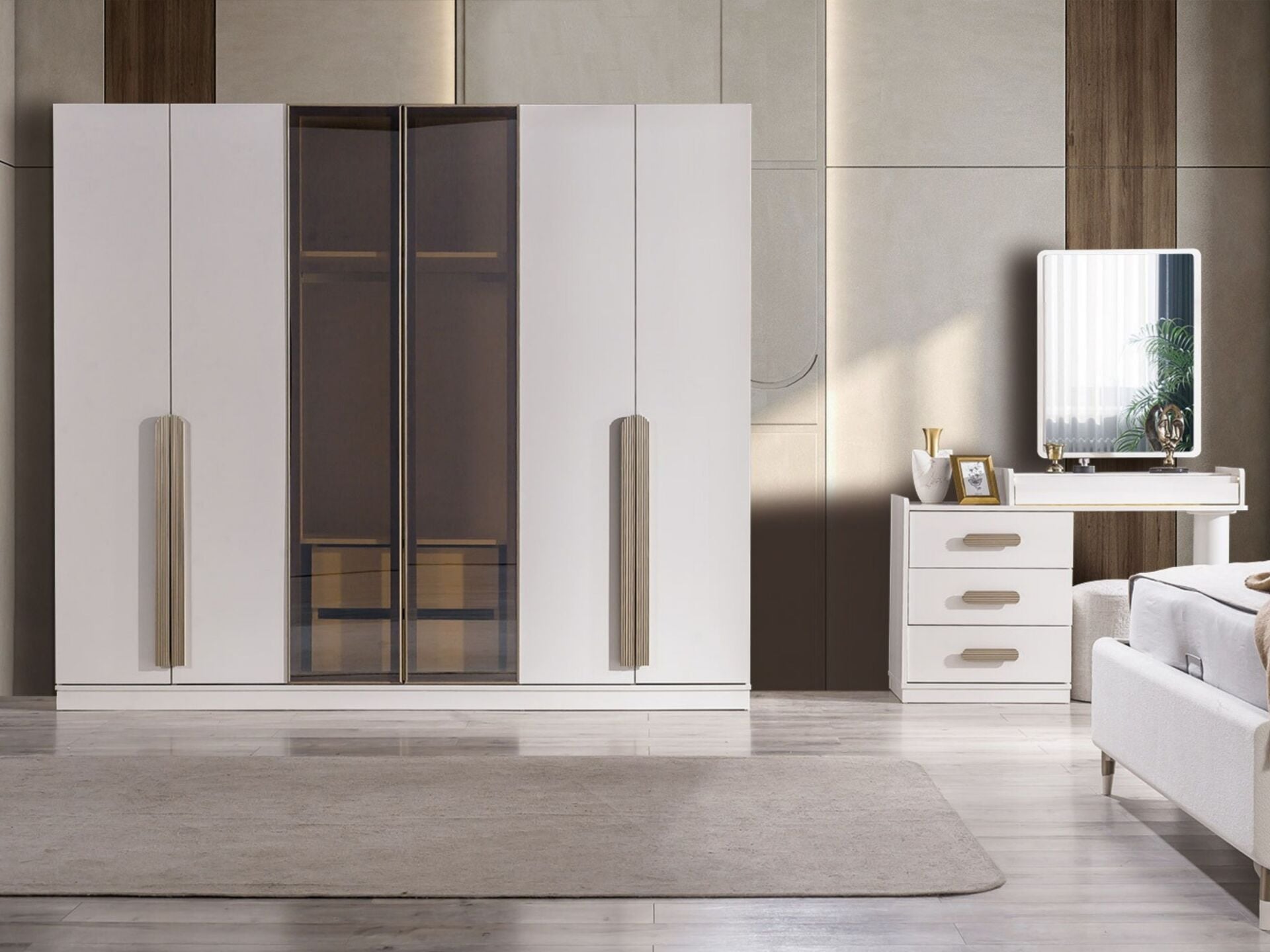 Takım standart içeriği 1 adet 6 kapaklı gardırop, 1 adet başlıklı bazalı karyola, 1 adet aynalı şifonyer, 2 adet komodinden müteşekkildir.