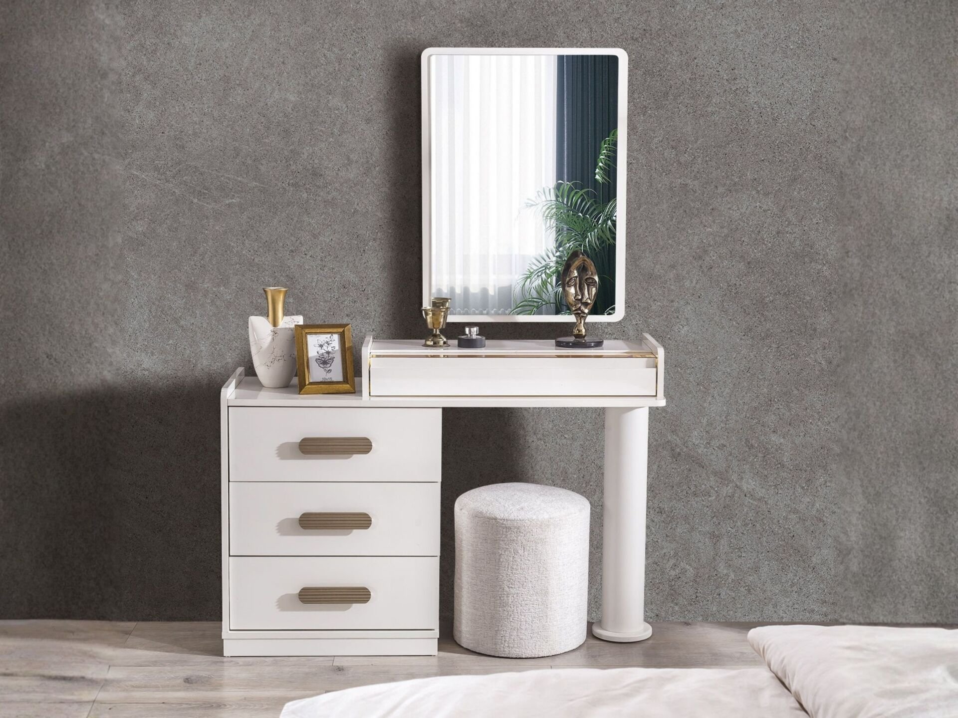 Şifonyer üst tablasının bir bölümü camdır. Bu camlı bölme ziynet çekmecesinin teşhiri olarak tasarlanmıştır. Birisi ziynet çekmecesi olmak üzere 4 adet çekmeceye sahiptir. Çekmeceler ray ve yavaşlatıcı kullanılarak imal edilmiştir. Ayna dekoratif bir tasarıma sahiptir. Mukavemete ve çizilmeye dayanıklıdır. Ayaklar ahşap malzemedir. Komodinlerin dış yüzeyleri MDF malzemedir. 1 adet çekmeceye sahiptir. Komodinler ahşap ayaklı olarak imal edilirler. Ürünü modüler olarak ayrı ayrı satın alabilirsiniz. Ürün ölçü ve renk seçeneklerinde değişim arzu ederseniz lütfen talebinizi ürünü satın almadan önce müşteri temsilcimize iletiniz. Ölçü ve renk değişimi her ürün için mümkün olmayabilir.