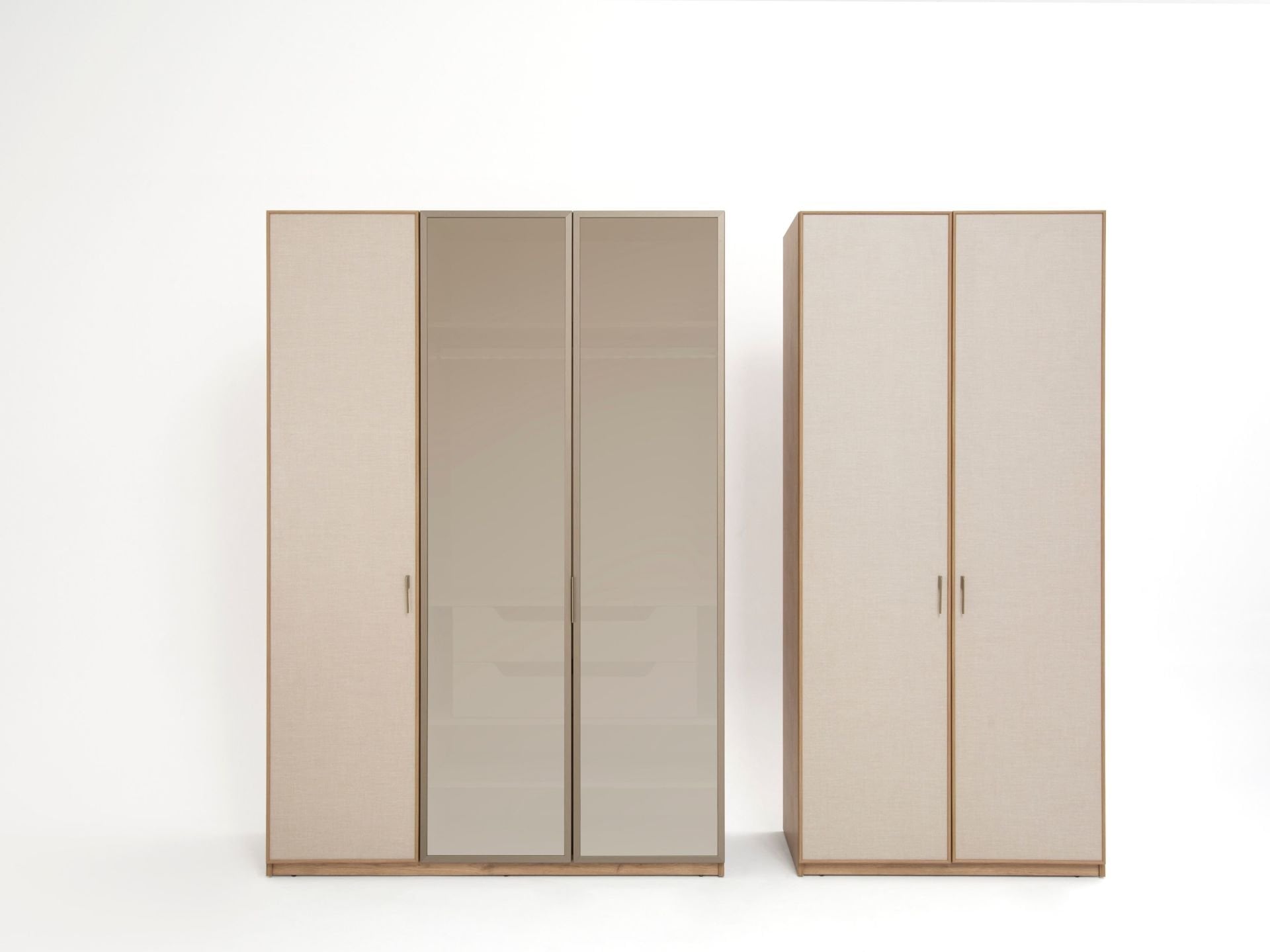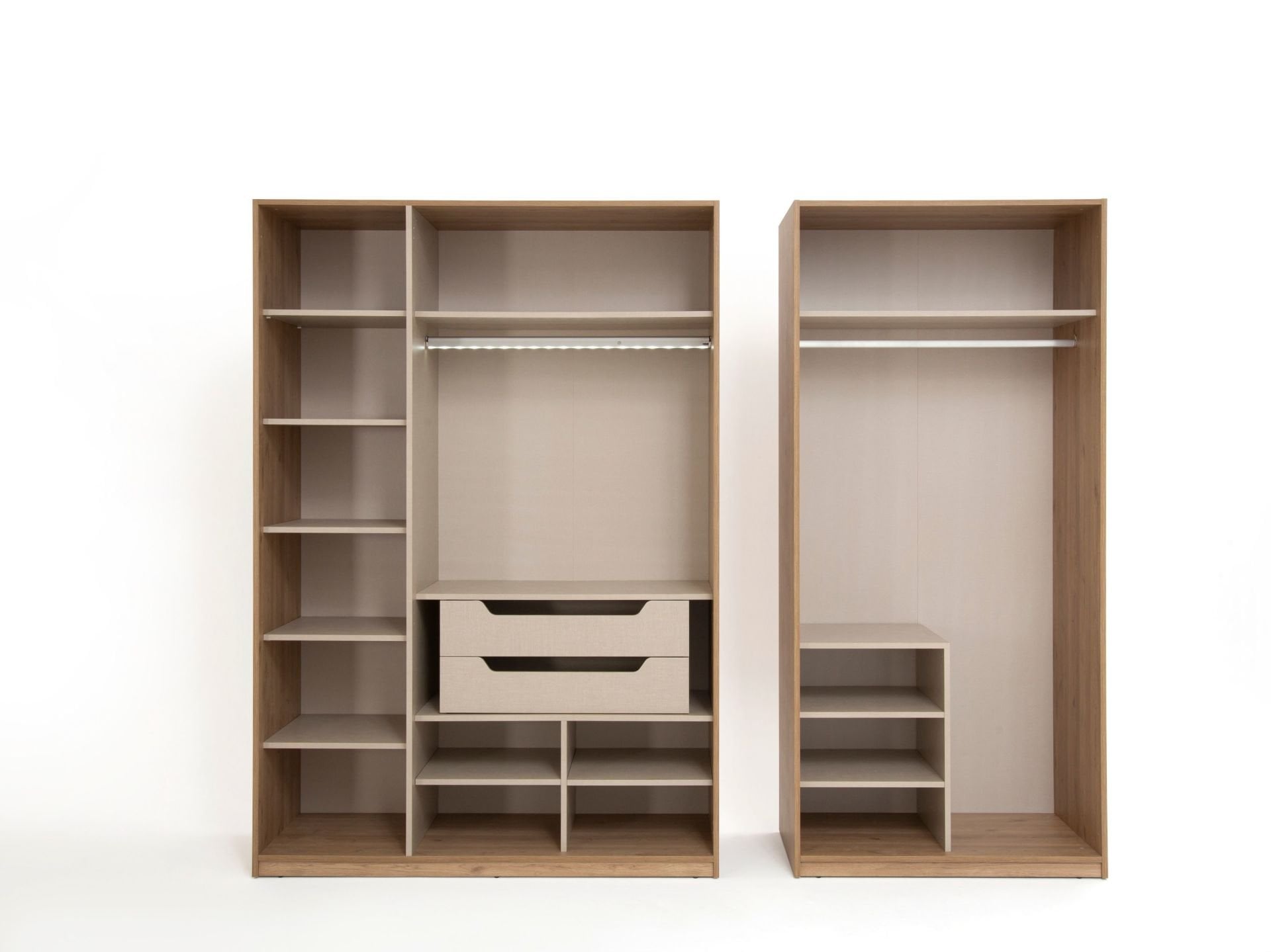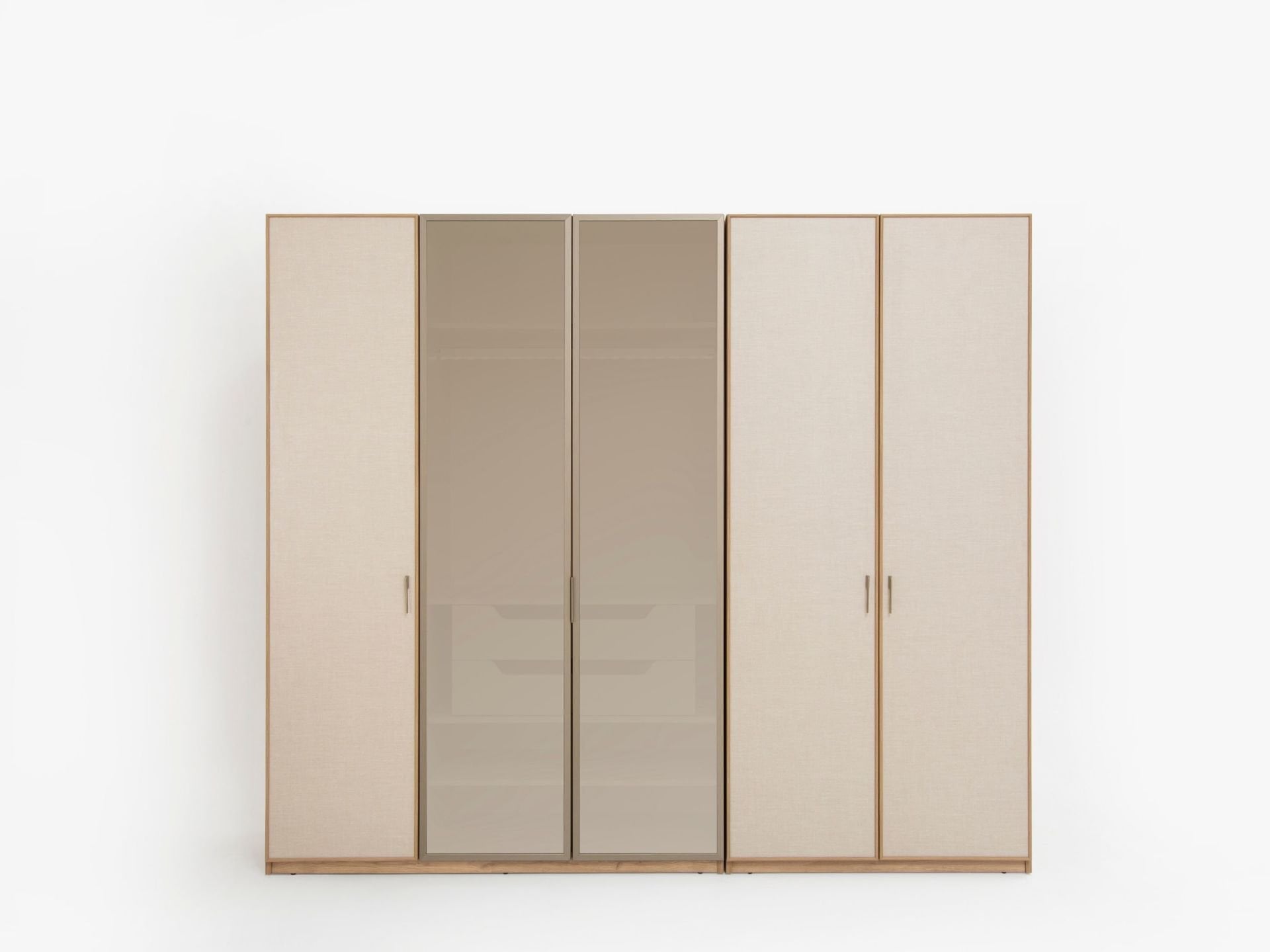 Dolap modüler olarak 3+2 şeklinde imal edilmektedir. Dilerseniz ürünü odanın farklı yerlerine parçalı olarak ta yerleştirebilirsiniz. Ahşap kapaklar ve dış görünür yüzeyler MDF malzemeden imal edilmiştir. Ahşap kapaklar yeni nesil kaplama olarak üretilmiştir. Kabarma ve solma görülmez. Yan yüzeyler de aynı renktedir. Üçlü modülün ikisi cam kapaklıdır. Aynı şeklide dışarı bakan tarafları da cam çerçeveli olarak imal edilmiştir. Camlı olan kısımlar aynı zamanda LED aydınlatmalıdır. İç bölmede raylı çekmeceler yer alır.