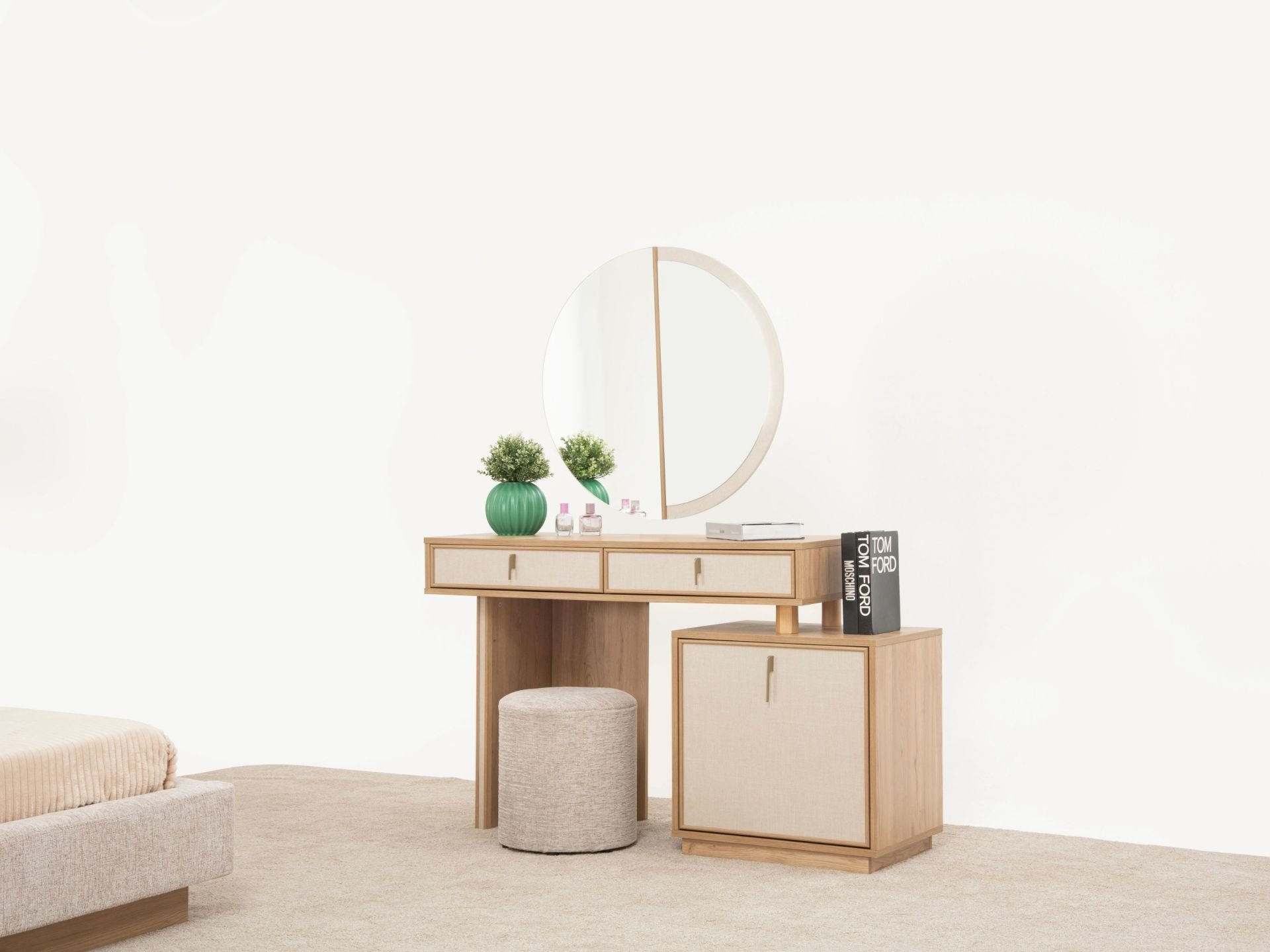 Takım standart içeriği 1 adet 5 kapaklı gardırop,1 adet başlıklı bazalı karyola, 1 adet aynalı şifonyer, 2 adet komodinden müteşekkildir. |
