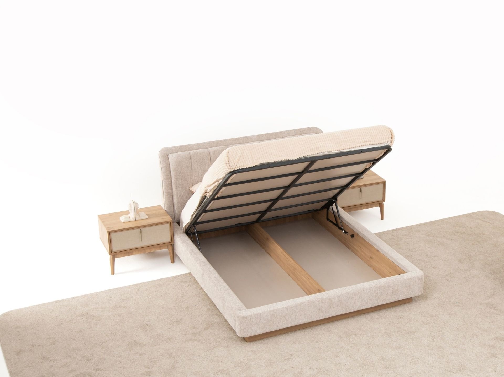 Ürün başlıklı bazalı karyola biçimindedir. Başlık ve karyola çerçevesi sünger üzeri kumaş kaplıdır. Başlık ve karyola çerçevesi yonga-levha malzemedir. Baza fonksiyonel olarak bölümlendirilmiştir.